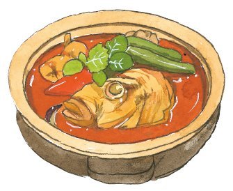 「フィッシュヘッドカレー」は、鯛の頭を豪快に煮込んだもの。魚の出汁とスパイスが絡み合った複雑な味が舌に残る。