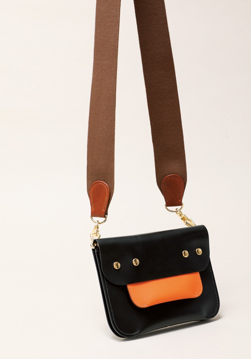 ポケットやストラップ、メタルパーツなどはバラ売りで、ドットボタンで脱着可能。ユニークな仕様に対し、素材となる革は某高級メゾン向けに生産されたもの。最高級レザーを使って自分好みにカスタマイズできる。H13.5×W19.5×D1.5㎝。本体¥39,600(税込)、ポケット¥17,600(税込)、ストラップ¥16,500(税込)/すべてサンカッケー(三角形 http://sunkakke.jp)