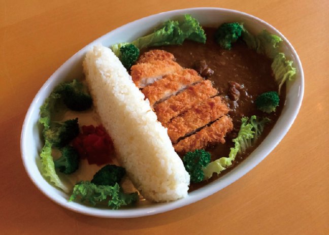 地元で捕れた鹿肉カツに鮎河米(あいがまい)を使用。カレーには、野洲川で捕れたワカサギの唐揚げが泳ぐ。他に、ココナッツ風味で猪肉のしぐれ煮がメインの「青土ダムカレー」もある。