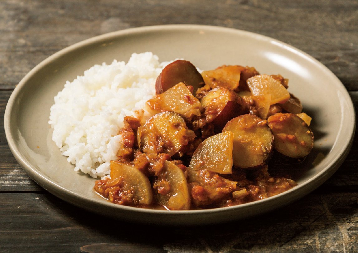 スープも肉も使わないのに、深みのある仕上がりに。大根からしみ出る旨味やサツマイモのほくほくした甘みが、スパイスによって引き出され、食べごたえも十分だ。肉派は、根菜のどちらかを鶏の腿肉1枚分に替えてもおいしい。
