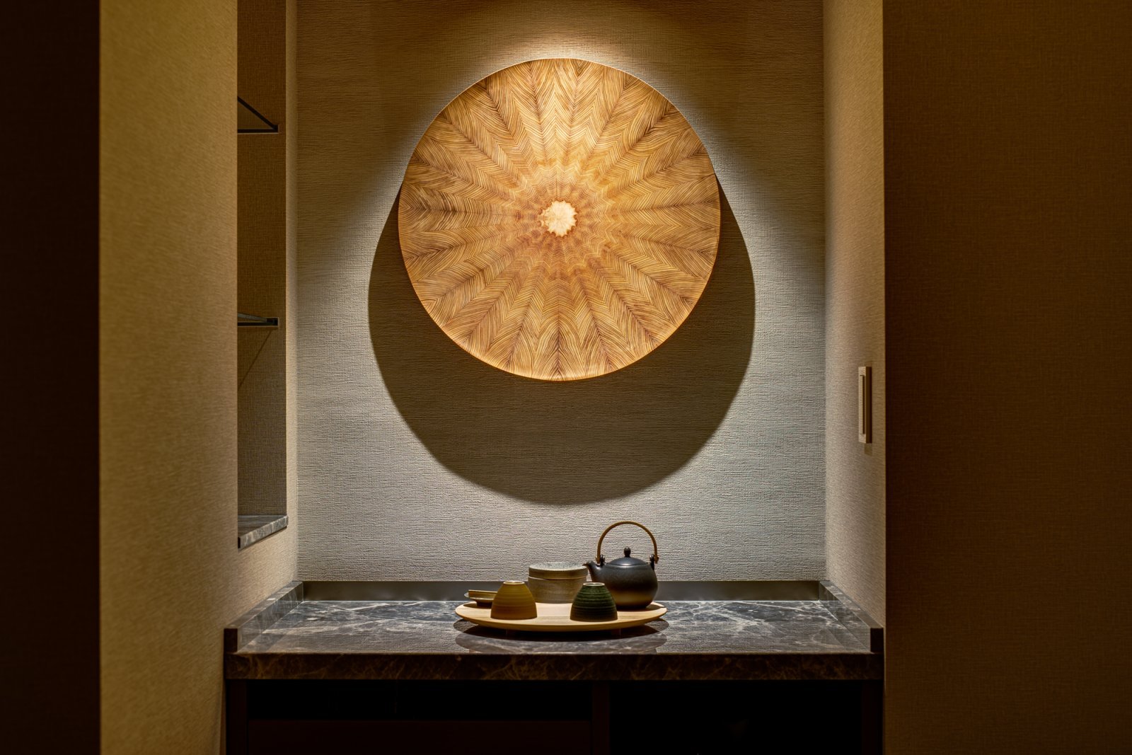 ロビーで目を引くのは、金網つじのランプシェードや細尾の西陣織ウォール。このホテルは「新時代の京の美意識」をコンセプトに掲げ、京都の伝統工芸を担う後継者6人によるプロジェクトユニット「GO ON」とコラボレーションしているのだ。公長齋小菅の繊細な竹細工は壁や棚に使われ、開化堂は客室入口のルームナンバーを記した照明を作成。中川木工芸 中川周士、朝日焼 松林豊斎の作品はスイートルームやレストランの棚に設えられている。オールメンバーが集結してホテルとコラボレーションするのは初の試みだそう。ほかにも書家の川尾朋子、陶芸の村田拓也、漆の西村圭など、京都を中心に活躍する作家たちが参画。京都の新たな美や手仕事を館内のあちこちで感じることができる。