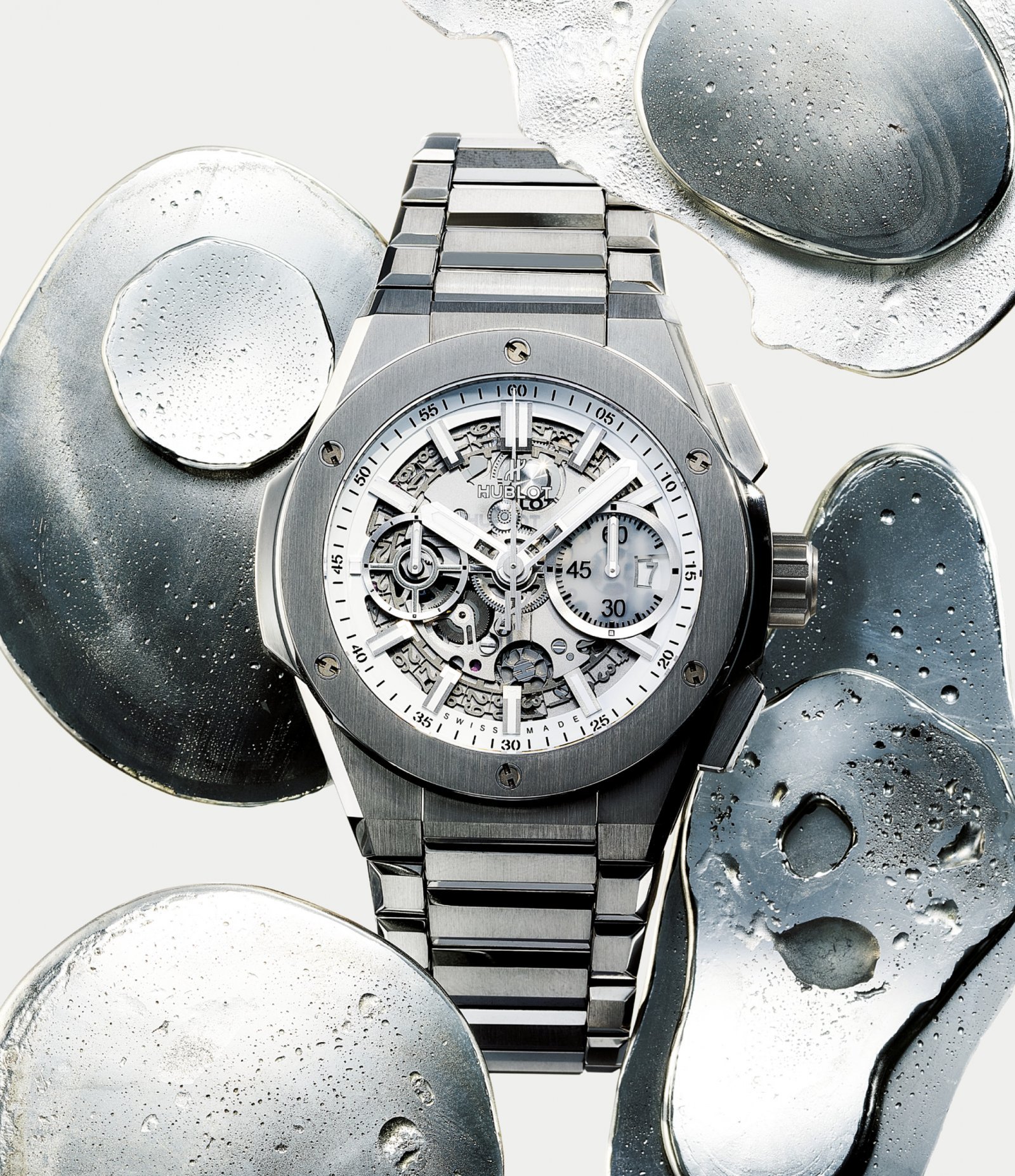グレード5のチタンをサテンとポリッシュのツートーンで美しく仕上げた。磨き上げた鏡面と艶消しとのコントラストは見事で、ケースからブレスレットへの流麗なデザインを引き立てる。ベゼル上のアイコニックなH字型ビスもチタン製だ。コラムホイール式のクロノグラフ機構をダイヤル側から眺められる自社製ムーブメント「ウニコ 2」を搭載。
