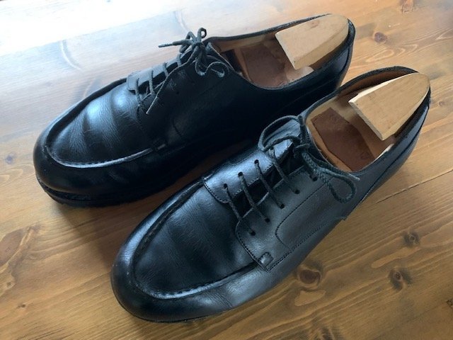 しかしどのローファーも私には合わなかった。もちろんすべてフランスで試着してから購入している。おそらく私の足型が悪いのだろう。痛い目に遭うのが嫌でほとんど新品のまま仕舞っておいたローファーもある。ところが180 シグニチャー ローファーと並ぶ同ブランドの2枚看板、「ゴルフ」は違っていた。足幅などが調節しやすい、外羽根タイプのひも靴ということもあるのだろうが、履いた瞬間に「これだ」という感覚もあった。履き込むとさらに足に馴染んだ。そもそもソールがラバー製なので、フランスやイタリアの石畳を仕事で歩くのには最適。同じひも靴のオールデンの「990」というプレーントゥも当時よく履いていたが、長い間履く革靴としてはラバーソールのゴルフのほうが私には合っていた。
