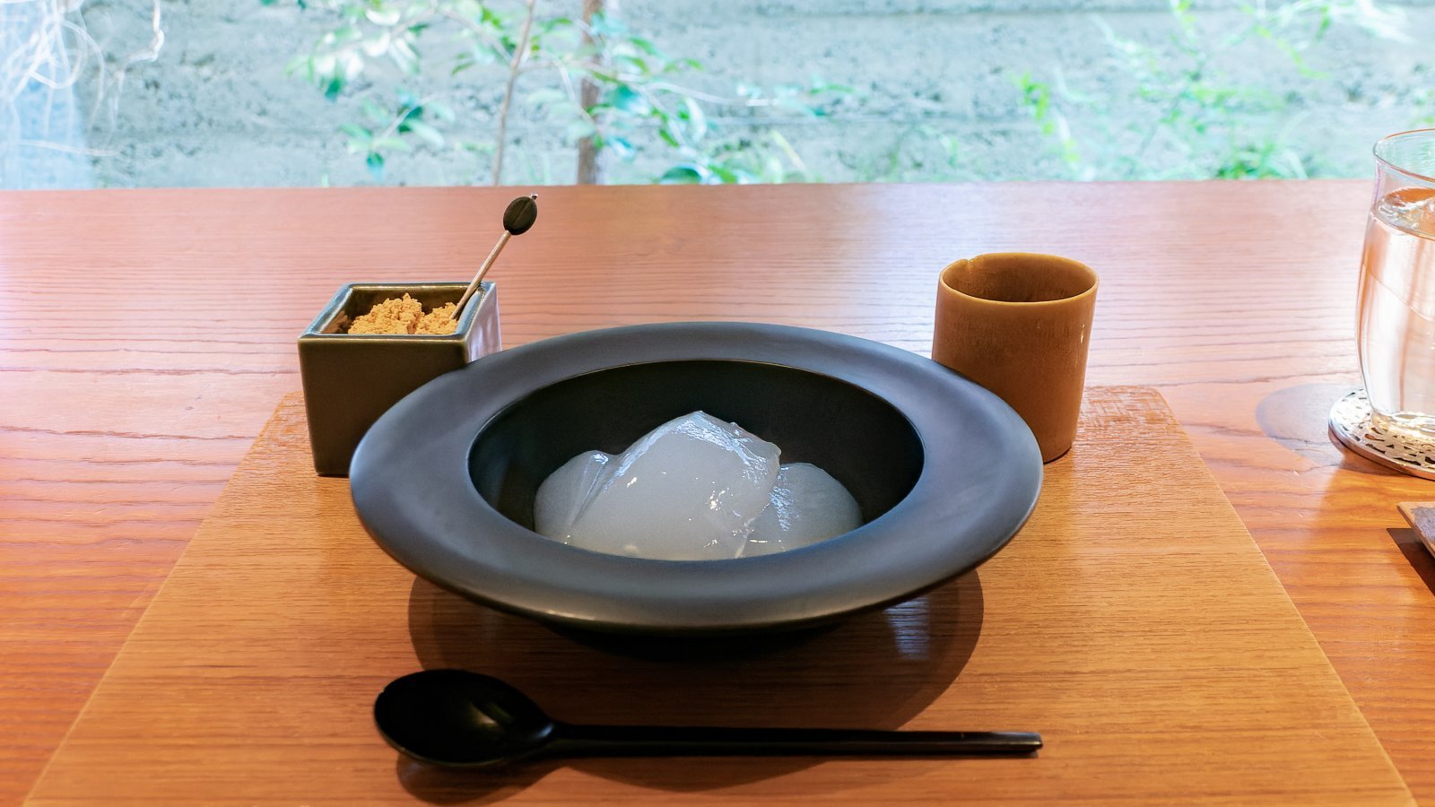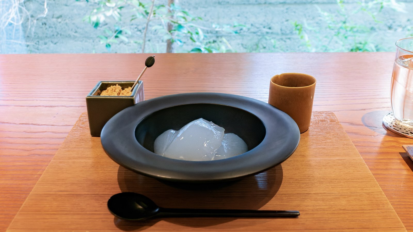 「本体に味がついているからまずは何もつけずにどうぞ」との案内でサーブされたくず餅セット。