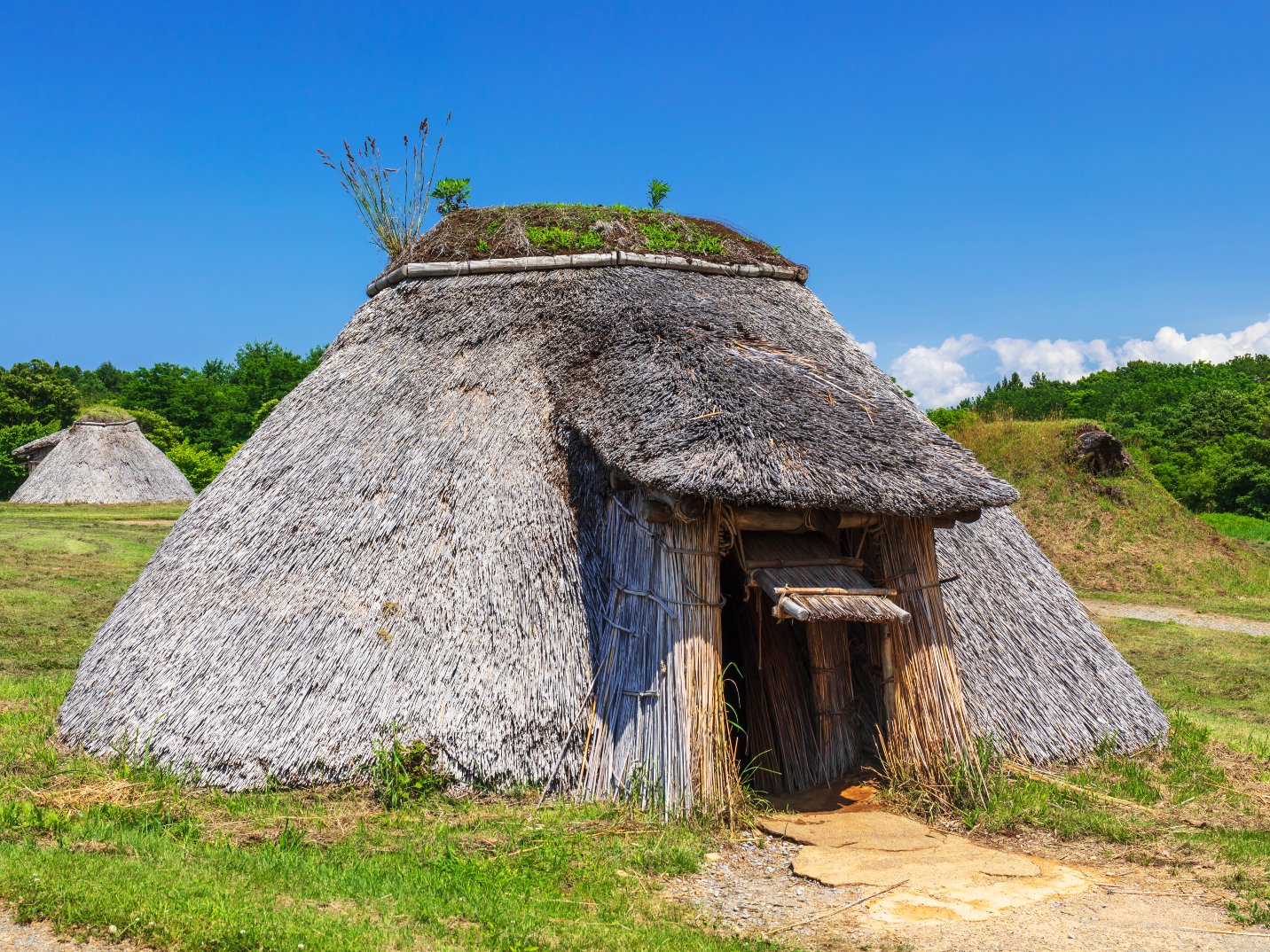 青森市にある日本最大級の縄文集落跡・三内丸山(さんないまるやま)遺跡(写真上)ほか多くの遺跡で竪穴式住居跡が発掘されており、復元された様子が見学できる。竪穴式住居は日本最古の建物で、紀元前1万4000年頃、縄文時代から建てられるようになったと考えられる。この遺跡に残っていたのは、直径数ⅿから十数ⅿの竪穴と深さ1ⅿほどの柱穴だった。復元では4本ないし数本の柱を立て、梁や桁、垂木を組んで茅葺などの屋根をかけ、土間の室内には、炉を設けた。