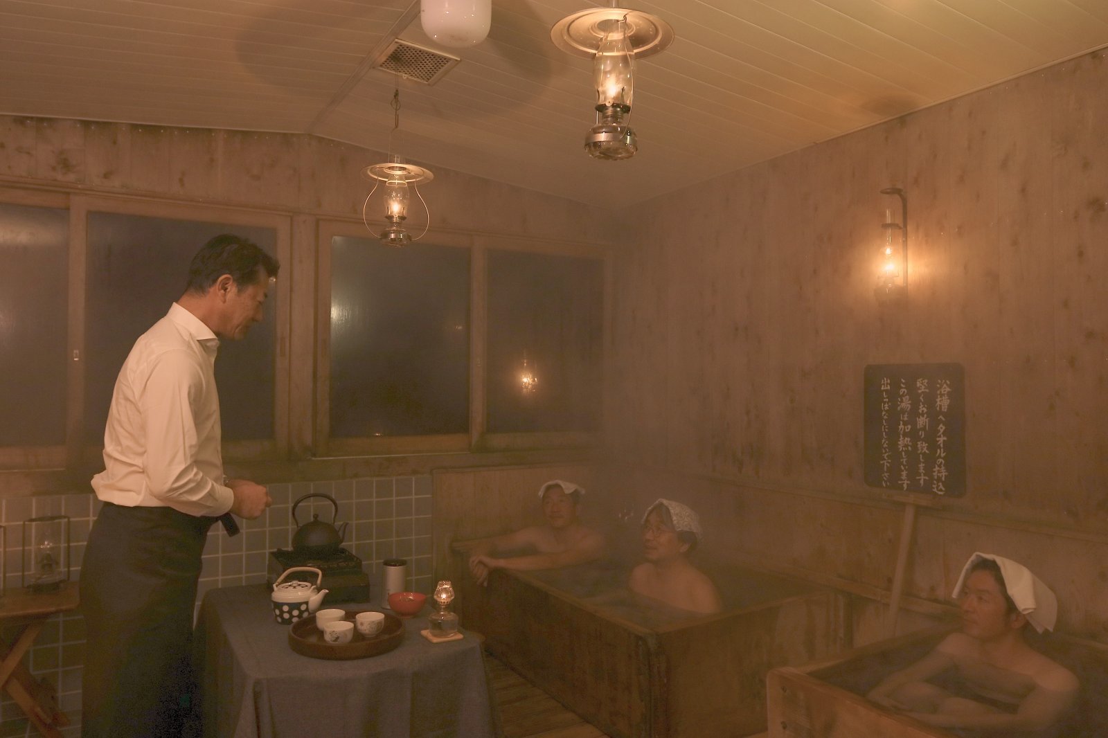茶の湯ならぬ「茶と湯」という遊びを考えた。 舞台は裏木曽にひっそりと佇む「ランプの宿 渡合温泉」。携帯の電波は届かず、電気すら通っていない点は江戸の終わりと変わりない。木を知り尽くした6代目の主人は、最も水に強い高野槙で浴槽を設えた。底のみが五右衛門風呂式になっており、弱アルカリの冷鉱泉を薪で沸かしている。外はマイナス15℃。湯煙が立ち込める中、南木曽の仲間たちとともに極上の湯に浸かった。そこに歌舞伎役者の顔も併せもつ茶師が現れ、湯に合わせて茶を淹れる。一杯目は、木曽を舞台にした島崎藤村の『夜明け前』にも登場する、ねぶ茶と呼ばれる健康茶。熱い湯に浸かっていると嗅覚はさらに鋭敏になるのか、その香りにやられた。汗が額を伝い始めたところで二杯目が供された。外の深雪をイメージしたかき氷に、熱々のほうじ茶を注ぐ。氷はたちまち溶けて、瞬時に冷茶に変わる。このお茶の美味いこと!紛れもなく人生一の冷茶である。溶けきれずに器の底に残ったわずかな氷を見て、私はこの茶に「春雪」という銘をつけた。