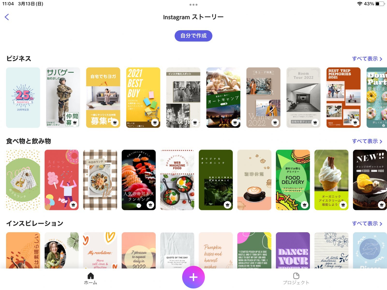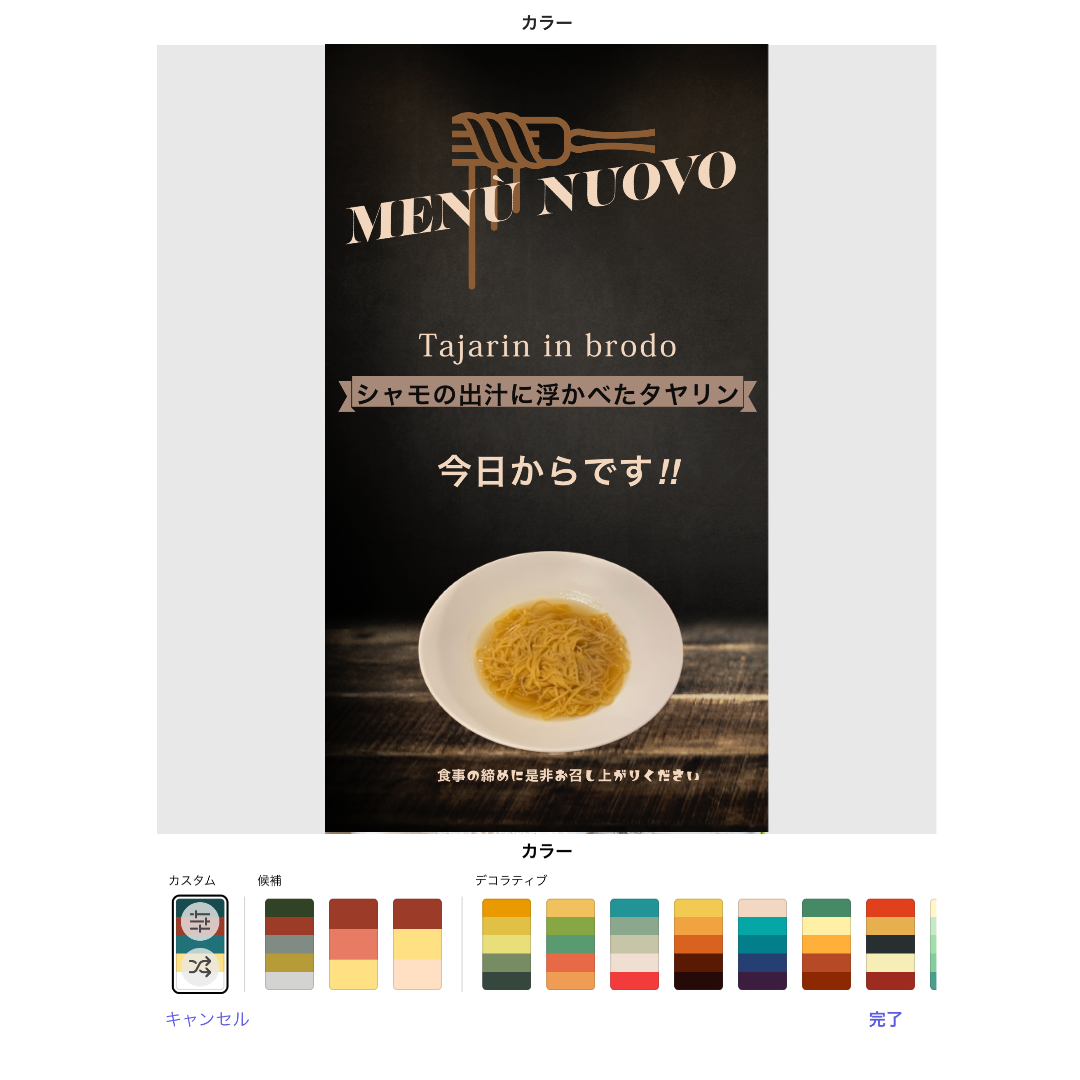 写真加工アプリも使った経験がないという田中さんだが、料理の写真は自分で頻繁に撮っている。そこで、新作の一皿をモチーフにした人目を引きつけそうなストーリーズの制作にとりかかる。テンプレートの中から気に入ったものを選択し、テキストと貼り付ける画像を入れ替えていく。