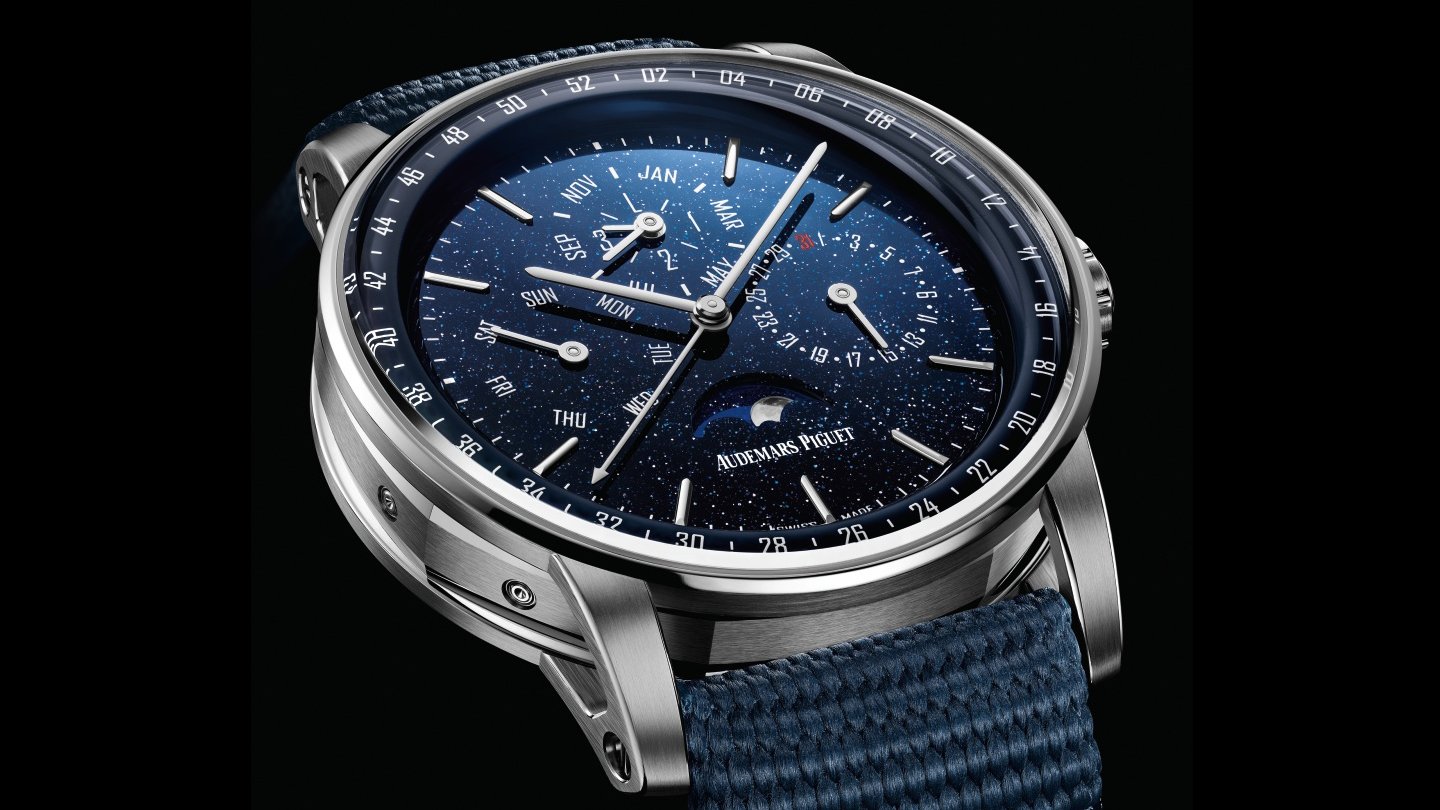 複雑時計の名門として知られるオーデマ ピゲは、1955年に世界初の閏年表示を備えたパーペチュアルカレンダーを発表。78年には厚さ3.95㎜という当時の世界最薄自動巻きムーブメントを開発しており、この分野のパイオニアとして知られる。2019年に誕生した新コレクション「CODE 11.59 バイ オーデマ ピゲ」でもパーペチュアルカレンダーが最初からラインナップされていたが、ダークブルーのアヴェンチュリンダイヤルを採用。高度な複雑機構だけでなく、悠久の夜空を想わせるロマンチックな煌めきが魅力だった。このモデルのケースは18Kピンクゴールドだが、2022年の新作として18Kホワイトゴールドのバージョンを追加。メタリックなシルバーカラーのケースによって、美しい星空に清涼な雰囲気が加わったといえそうだ。