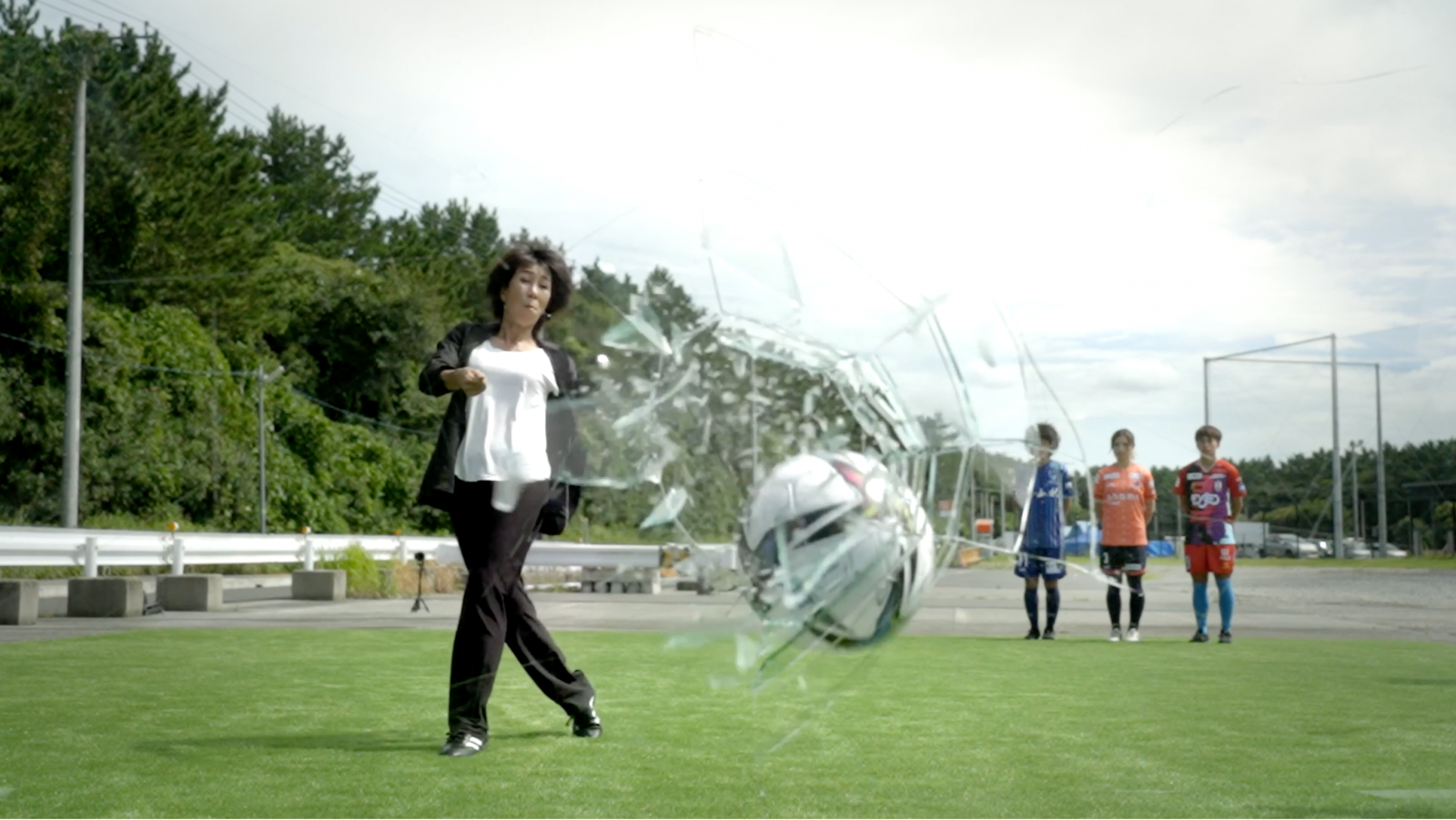 サッカーフィールドに現れた、岡島喜久子チェアと現役3選手。1人ずつ、ゴール前の大きなガラス板に向かってボールを蹴った。砕け散る破片、拍手、笑顔。
