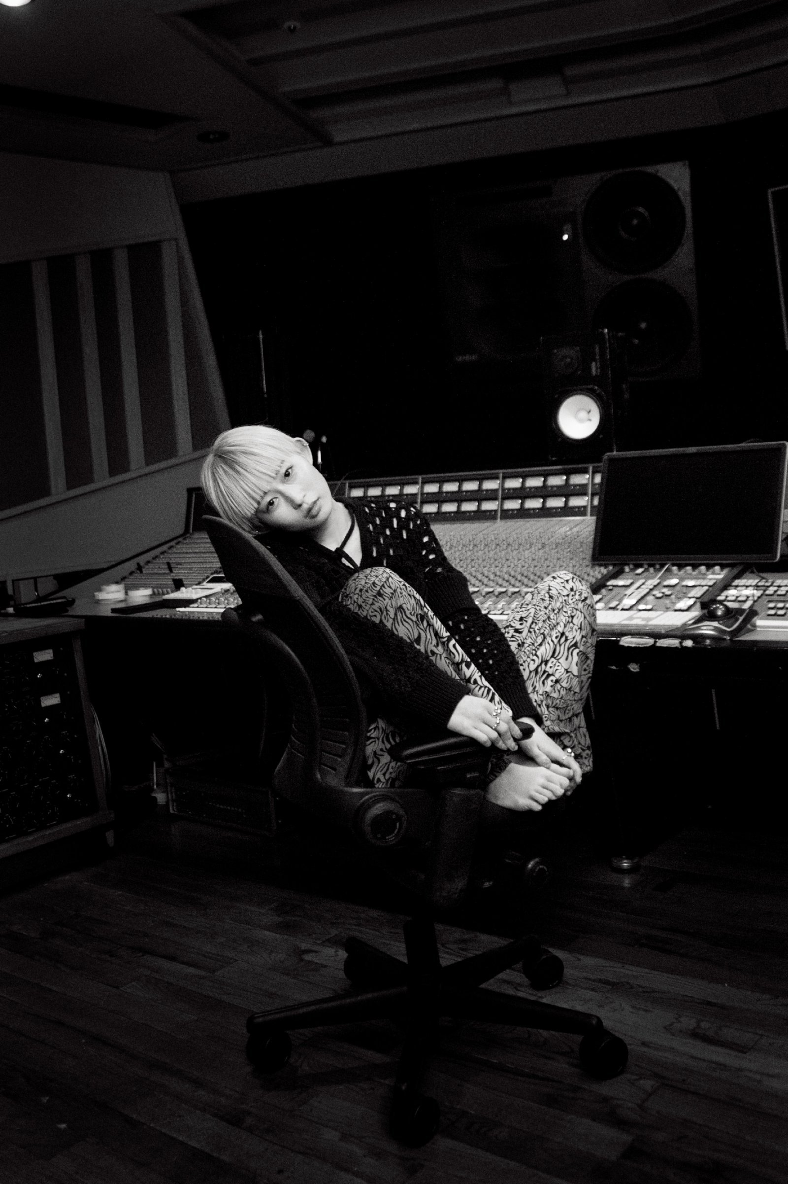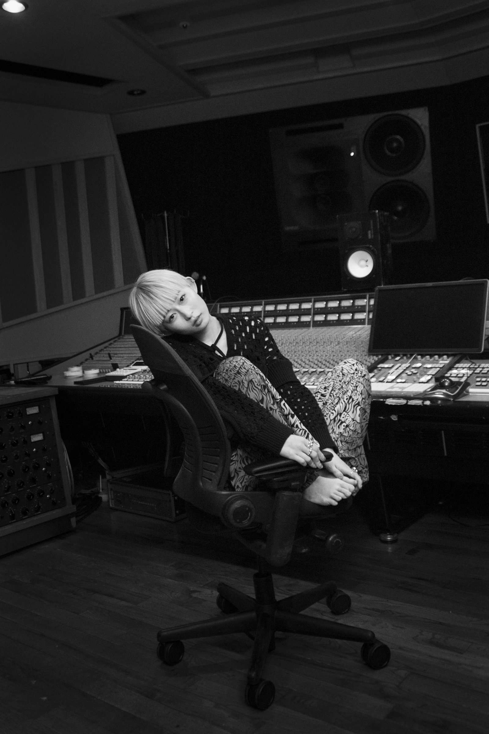 レコーディングでしばしば長い時間を過ごすというスタジオに現れた、Awesome City ClubのPORIN。髪の色はトレードマークだったブルーからブロンドへ変わり、新しい年を迎え、ニュー・アルバム『Get Set』の発表を前に気持ちを新たにしていることを印象づける。