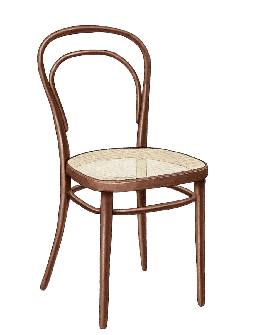 無垢材を蒸気で曲げるという技術を生み出したトーネットの代表作。当初は「No.14」と呼ばれ、わずか6つの部材だけで構成されている。製作段階では各部材ごとに加工し、販売店または購入者が組み立てるという「ノックダウン方式」を普及させた点でも、現代のデザインに多大な影響を及ぼした。軽量で大量生産に適し、輸送コストまで計算され尽くした曲木椅子は、この時代まで上流階級向けが主流だった家具の様式を一変させていった。