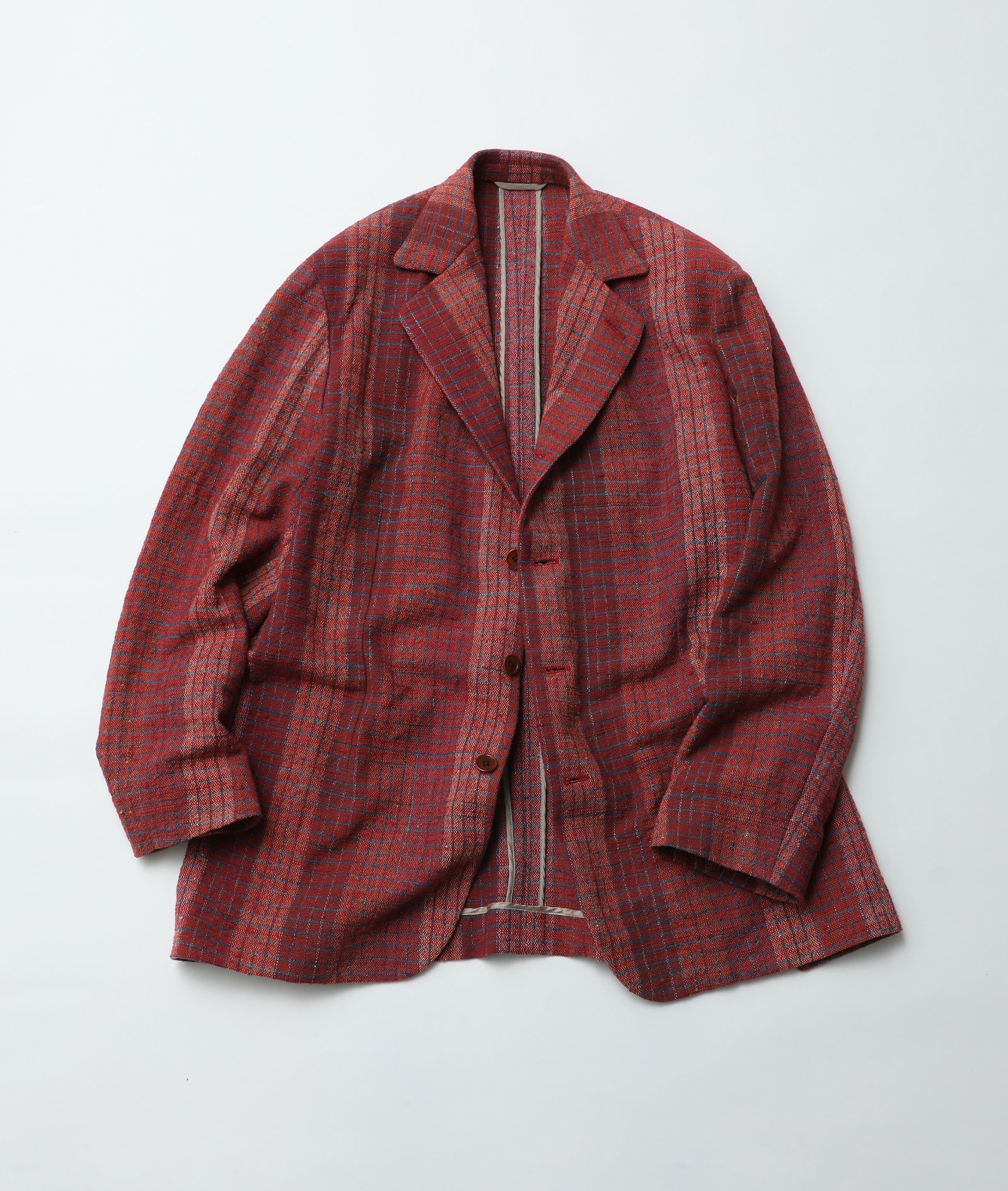 90年代初頭にイタリアで流行した、やわらかな印象のアンコンジャケット。さまざまな部位の芯地を省き、ショルダー部分に補強布のみを当てることで美しいAラインを強調している。生地はラオスで手紡ぎされた綿糸を草木染めし、手織り機で編まれたもの。ウールのようにザラザラとした手触りも新鮮だ。¥105,600(税込)/クラス(ウィリー www.wheelieltd.jp)