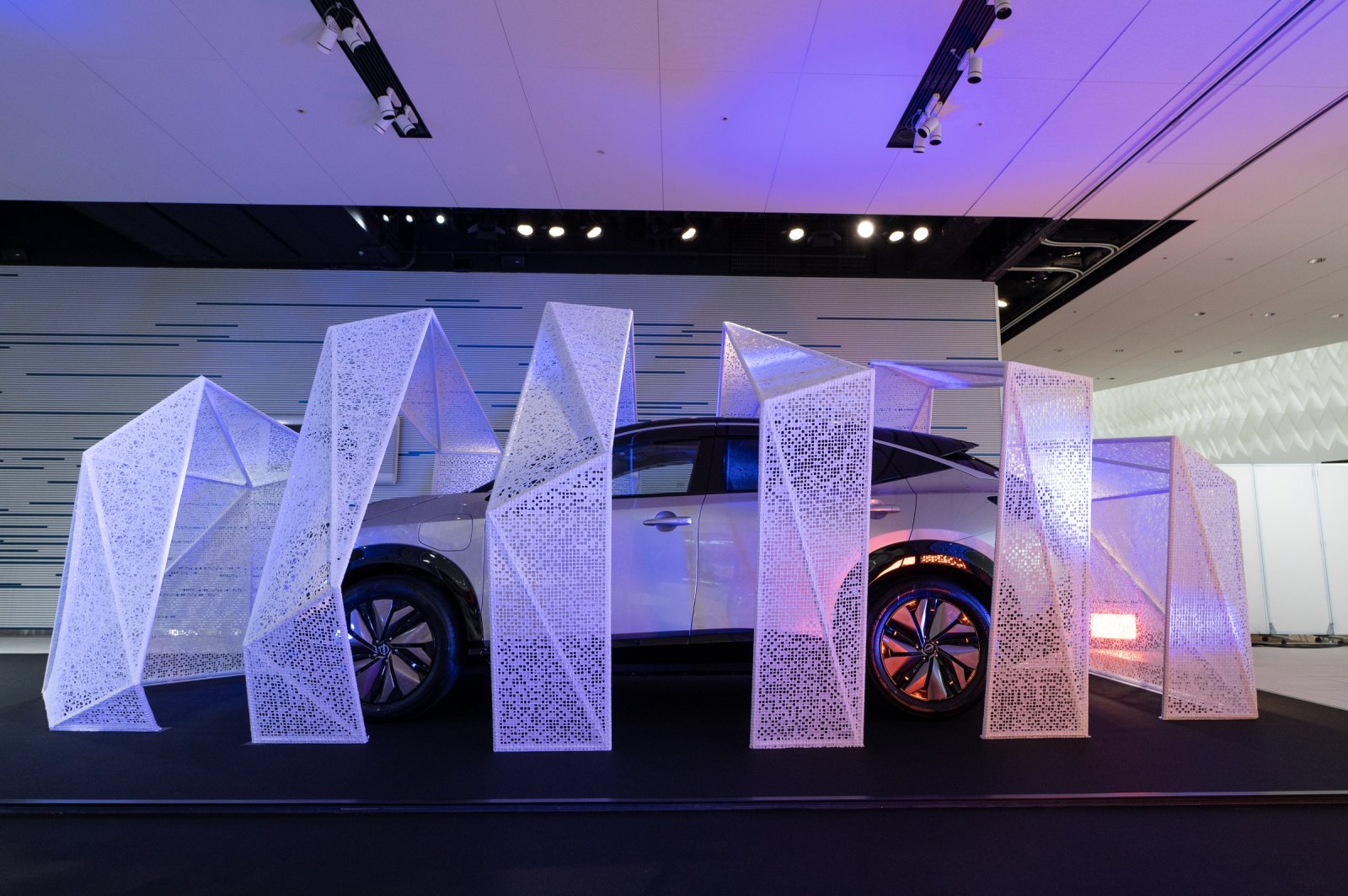 この印象的なカバーは和紙アーティスト、佐藤友佳理さんの作品「ARIYA STARTING BOX」。アリアのコンセプト「伝統技術と先進技術の融合」から想起し、パラメトリックデザインを取り入れ近未来を感じる形状に演出したアートな“繭”だ。佐藤さんは「アリア登場を、繭から美しい蝶が誕生するような瞬間を表現した」と、イメージを語る。