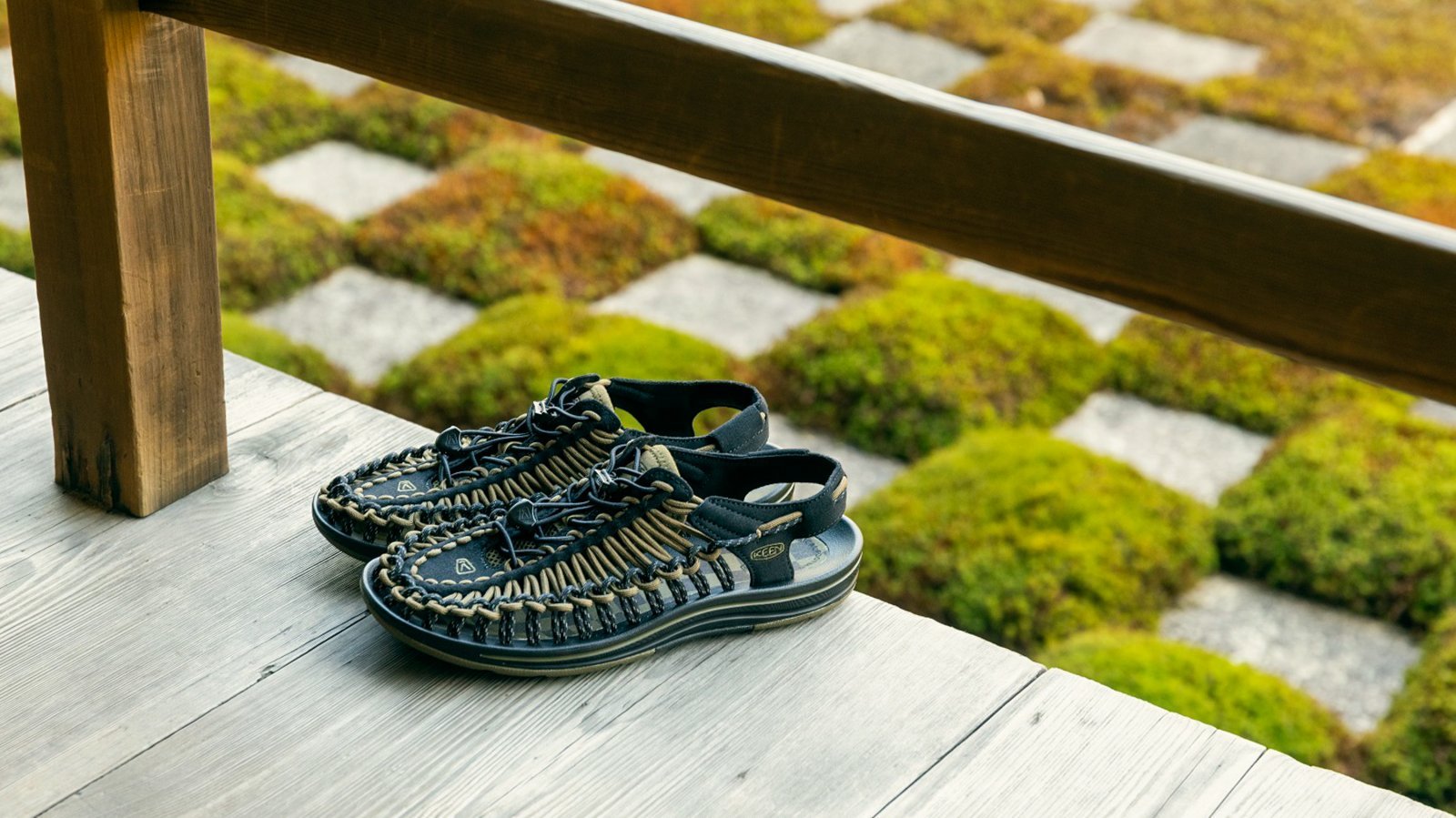 苔のグリーンと土のブラウン、それに焼き杉や漆のブラック。京都の“侘び寂び”の感性がキーンの定番モデル「ユニーク」を、趣味人の大人が履くのにふさわしい一足へと昇華させた。あたかも、ほうじ茶と抹茶の色にも感じられる楽しい配色。普段着に和の気分を与えたいときに大活躍するだろう。夏の浴衣や作務衣との相性の良さも抜群だ。むろんスポーツサンダル本来の活躍の場であるアウトドアやキャンプにもすんなりと馴染む。応用範囲の広いデザインである。