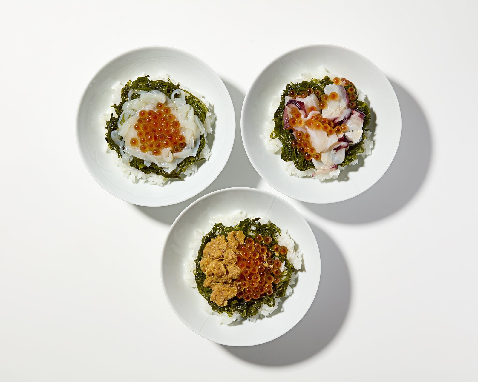 岩手県沿岸では獲れたてのウニを牛乳瓶に詰めて保存することから、宮古市の新名物として生まれた「瓶ドン」。こちらの3本セットは、岩手産のウニ、タコ、イカをメインに、三陸産のメカブとイクラが層を成す、目にも楽しい一品だ。味付けされているので、白米にかけるだけでおいしい海鮮丼が完成。中央にメインの具材をのせ、まわりにメカブを盛り付けると、店で出されるひと皿のよう。宮古観光文化交流協会の商標登録商品。