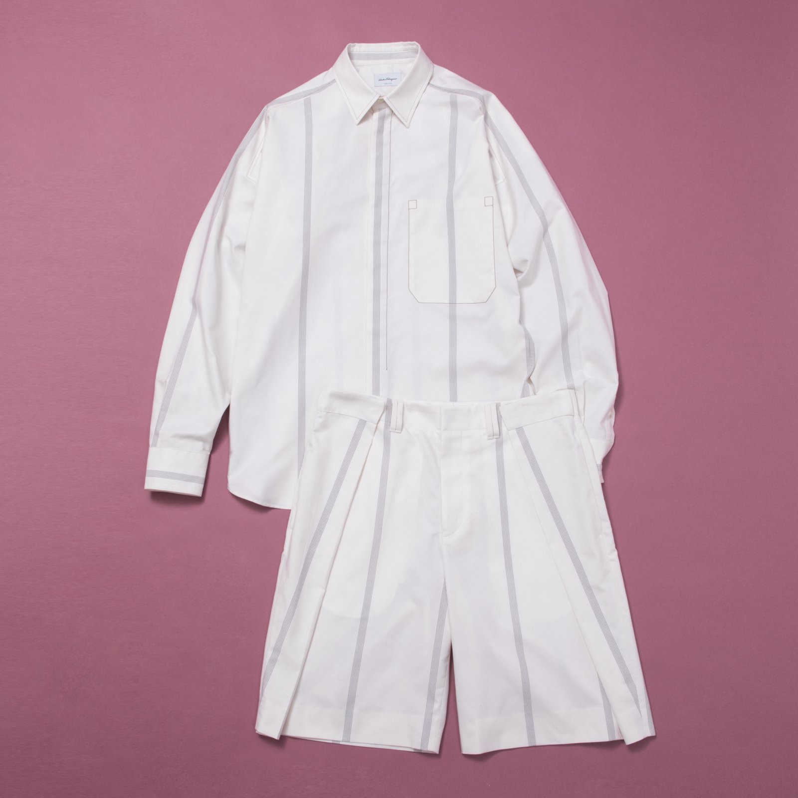 前を開けて羽織ることを想定して、胸ポケットを内側に配したオーバーシャツと、左右両端を折り返す仕様のワイドショーツ。素材はコットンオックスフォード。羽織袴のような雰囲気もあり、足元を雪駄でキメても面白い。