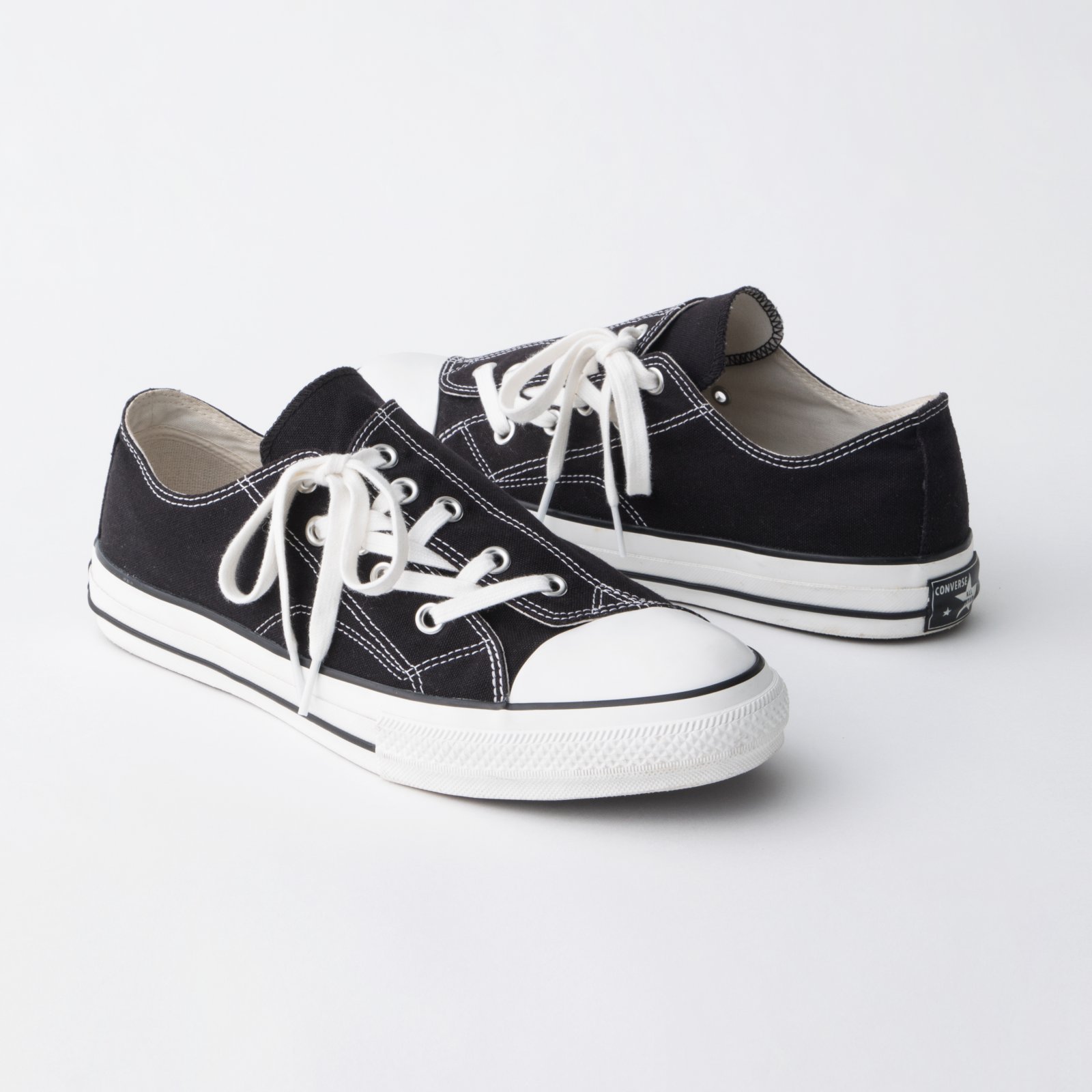 ベースになったモデルは、コンバースを象徴する名作「チャックテイラー」。トウキャップやシューホールの配置、ステッチワーク、トウガードに至るまでアシンメトリーに仕上げ、ヒールラベルには3つの星が対角線上に並ぶ、50 年代のデザインを採用。さらにアッパーにはオーガニックコットンを、ソールにはリサイクルラバーを使用するなど、地球環境へ配慮した要素も取り込んでいる。