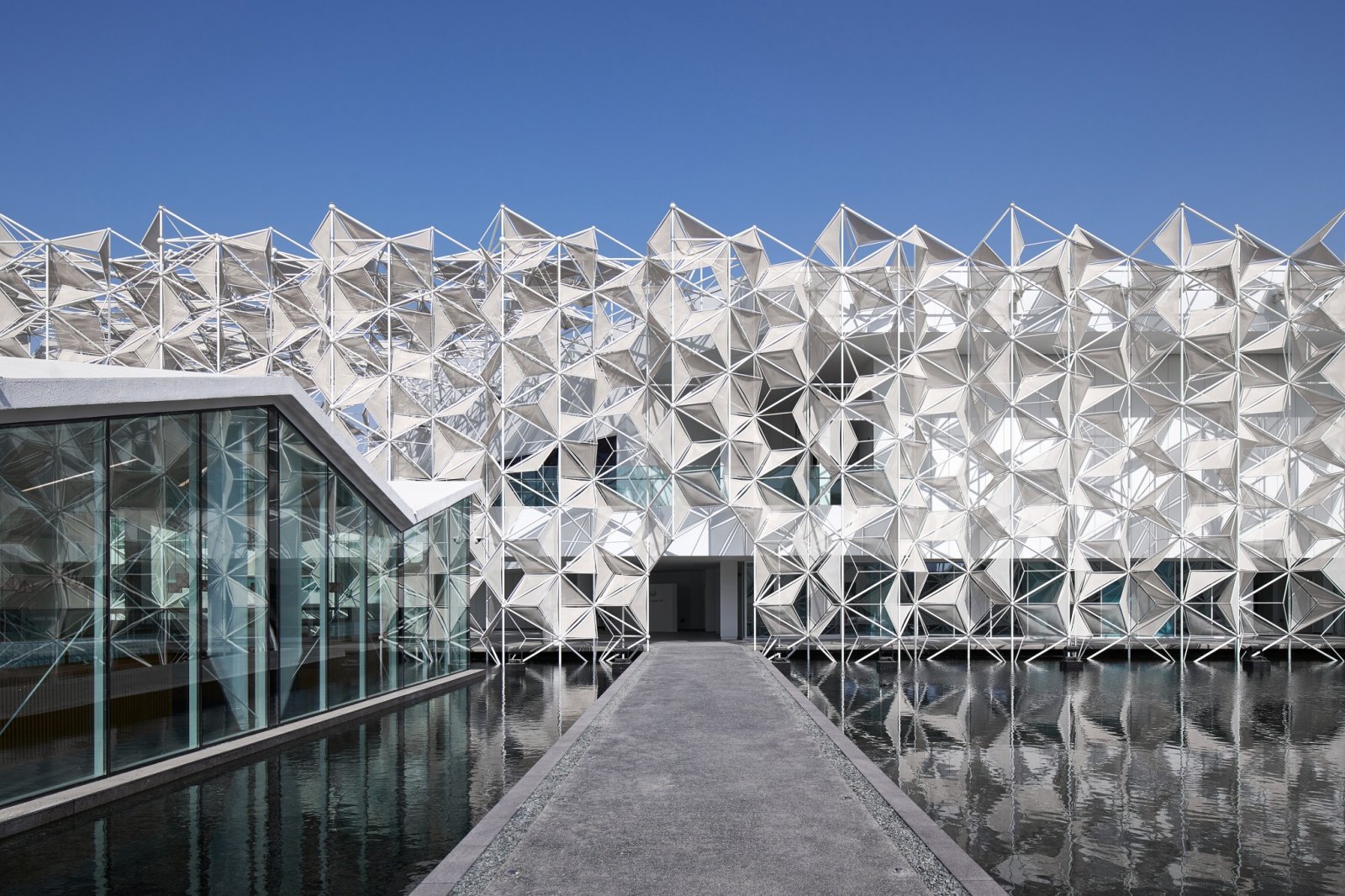 幕を使って暑い日差しを防いでくれるが、完全に閉め切っているわけではないので外からの風も入ってくる。さらには幕に影ができることで、建物にやさしい表情も生み出してくれる。このファサードは環境装置であると同時に、館の立体構造を与える存在でもあり、さらにはアラベスク風の麻の葉模様という1つのイメージを表すパターンとしての役割も担っているのだ。