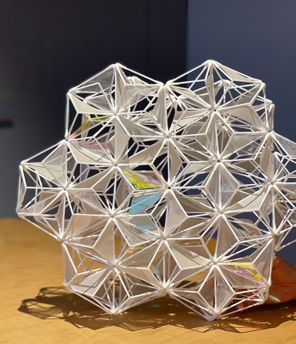 しかし、実はそこには建築的な計算もあった。紋様は2D、つまり平面的な絵だが、これを建築に応用するには立体的にしなければならない。建築では三角形を合わせて立体的な形を作るトラス構造という骨組みがよく用いられるが、麻の葉紋様は三角形なので、トラス構造のようにして立体に展開しやすいのだ。実際に永山さんは綿棒を使ってモデルをつくり、目指していた構造がつくれることを確認した。