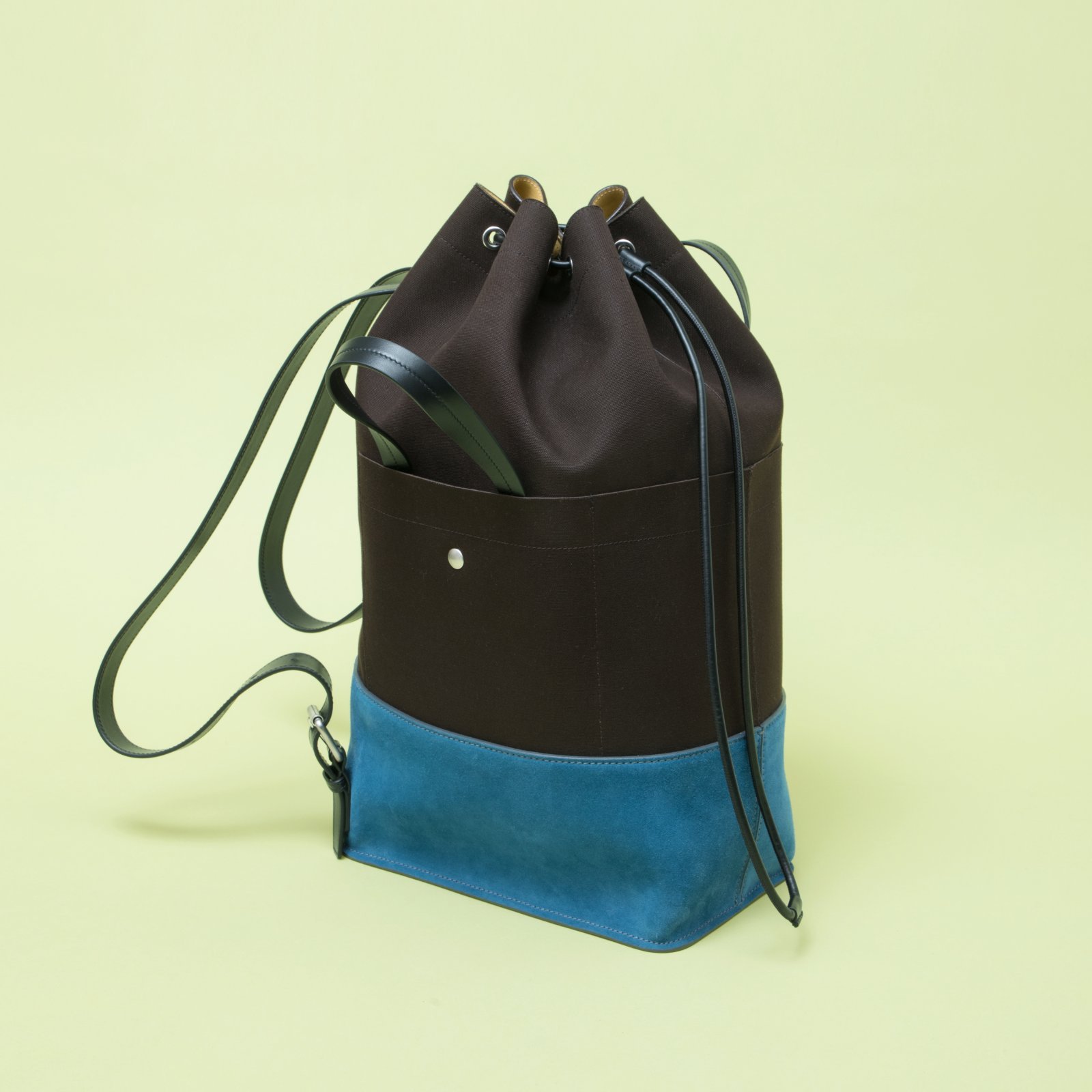 手持ち用ハンドルも備えた、巾着型のバックパック。コントラストの効いたブロック配色はジル サンダーならでは。本体生地はウォータープルーフキャンバスで、底面は人工スエードという素材使い。