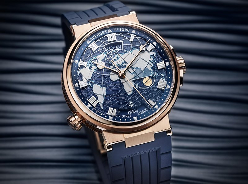 ブレゲでは10気圧防水のスポーティなコレクション「マリーン」に、3年を費やして4件の特許を取得した独自開発のムーブメントを搭載。インスタント・ジャンプ・タイムゾーン表示システムを備えた「マリーン オーラ・ムンディ」として発表した。ラテン語で「世界の時間」を意味しており、ボタンをカチカチと押すだけで、時差の異なる世界24都市を巡る旅に出かけられる。日付は3日分が表示されているが、U字型の枠が囲んだ数字が当日にあたる。12時位置の大きな窓の下に隠されたレトログラード針の先にU字枠が取り付けられており、日付のディスクと一緒に右端まで進むと次の日付に瞬時に戻る。ムーブメントは腐食や摩耗に強いシリコン素材で作られた脱進機を装備。磁気にも強いため、夜間の視認性を確保する蓄光式蛍光と合わせて、デイリーユースなどに幅広く活用できる。