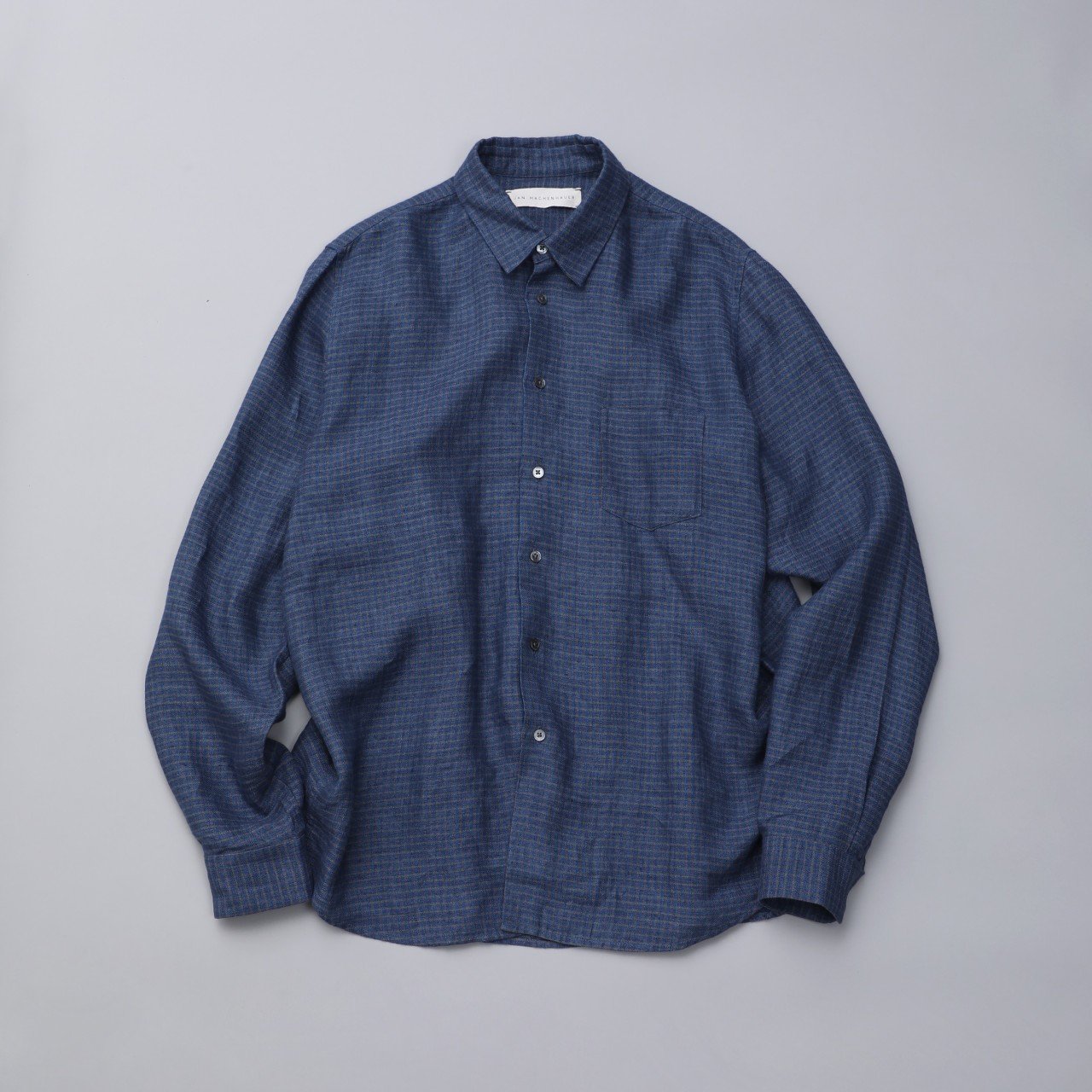 ヘリンボーンの入った深い青地に茶の線を走らせたチェック柄は、デザイナーが収集してきたデッドストックリネンを用いた今季限定の素材。「人と服の調和による美の追求」を考えるヤンマッケンハウアー。そのブランド哲学が反映された定番シャツ「クリス」は、美しく繊細な佇まい。¥41,800(税込)/ヤンマッケンハウアー(メイデン・カンパニー TEL:03-5410-9777)