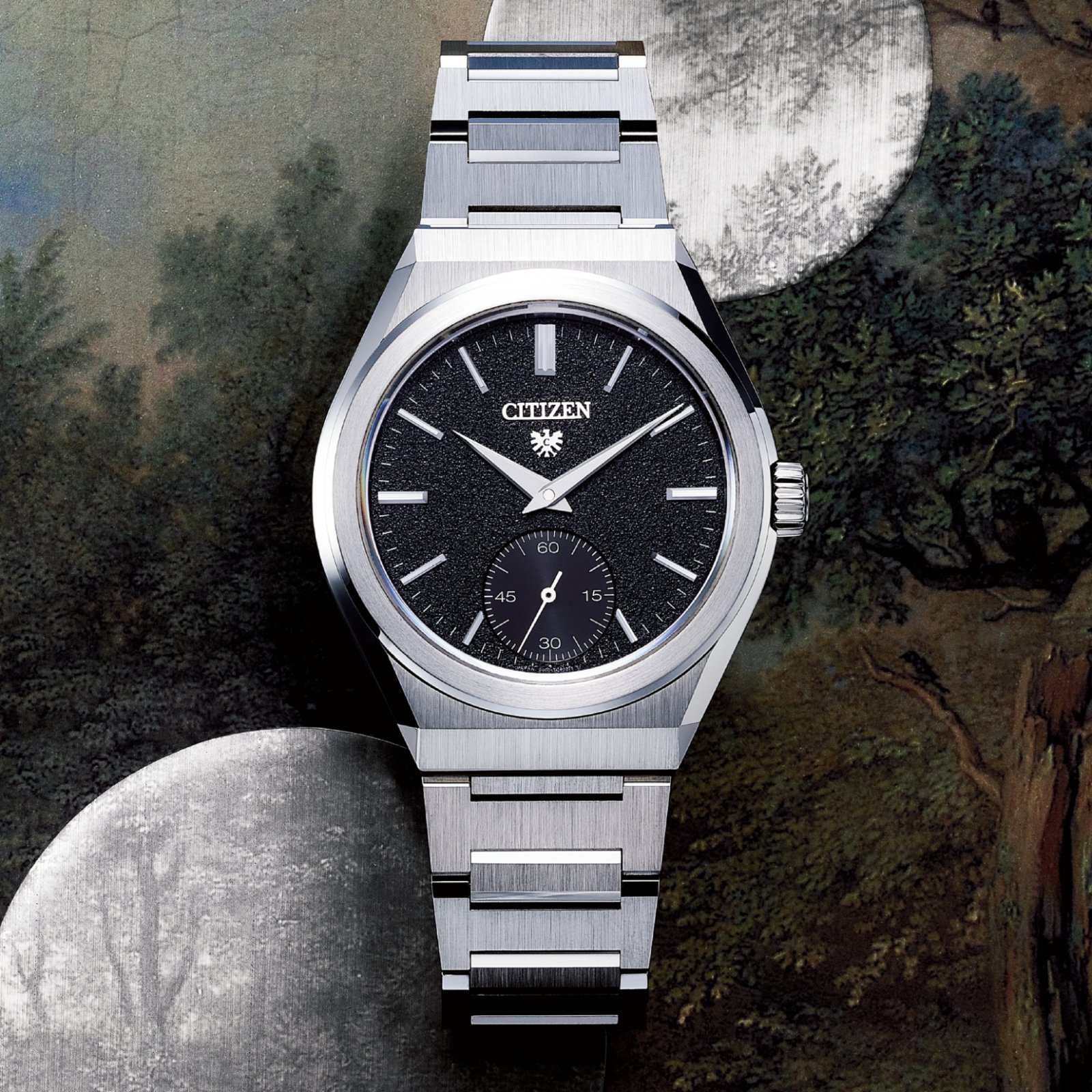 クラシカルなスモールセコンドモデルながら、シースルーのケースバックからのぞくのは新たに開発した機械式ムーブメント「Cal.0200」。傘下のラ・ジュー・ペレ社のノウハウを活用し、シチズンが自社設計・組立を行うムーブメントは、機械式の新型としては2010年以来となる。電鋳手法による微細な凹凸で砂地模様を表現したブラックダイヤルは、独特な風合いを見せる。
