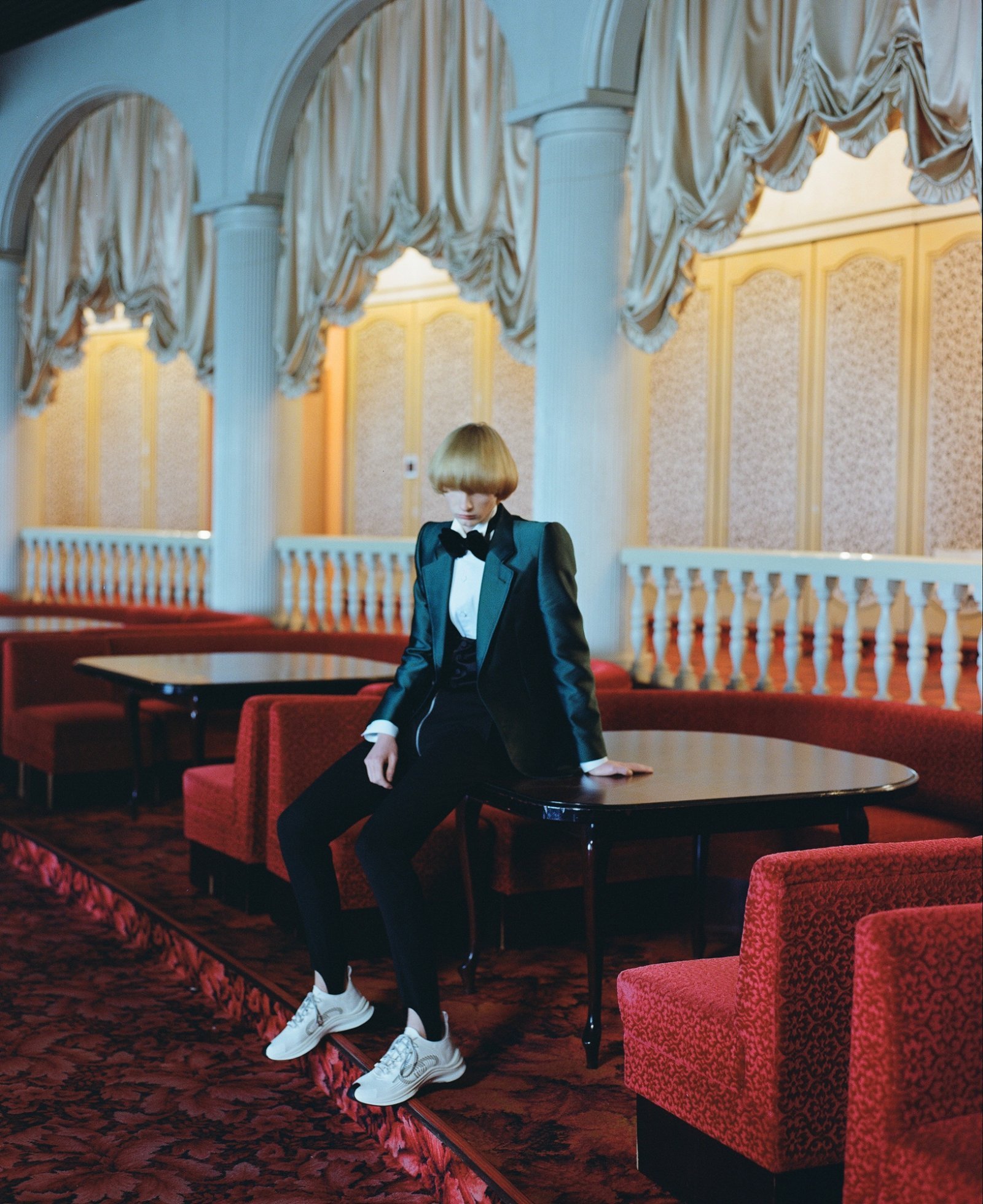 イブニングテイスト全開のサテンジャケットは、グッチを象徴するグリーンカラー。アクティブウェアの代名詞でもあるレギンス(スパッツ)をコーディネートする。ジャンルの垣根を飛び越えた合わせによって、新しいスタイルが誕生した。