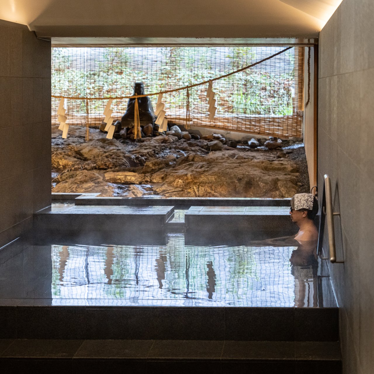 湯と向き合うことで感謝の気持ちを育む湯道にとって、これほど素晴らしい道場はない。しめ縄が張られた岩盤から潤沢に湧き出す湯に思わず手を合わせたくなる。感謝で終わらせず恩に報いるとはどういうことか、自然と考える自分がそこにいた。