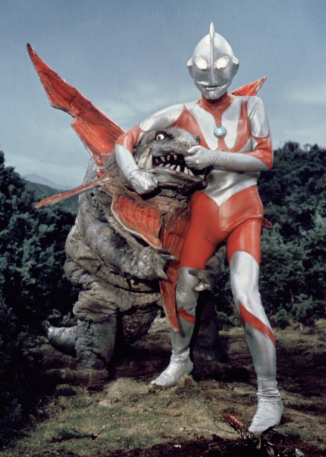 怪獣ガボラが出現する「ウルトラマン」の第9話。赤と銀のボディは皮膚なのか、服なのか。顔は素顔なのか、仮面なのか……。現在ではスタンダードなスタイルだが、当時はまったく新しいコンセプトのヒーローだった。弱点である3分間のみの活動時間や、別の姿に変身する主人公など、後のヒーロー番組のひな型をつくった金字塔的ドラマである。