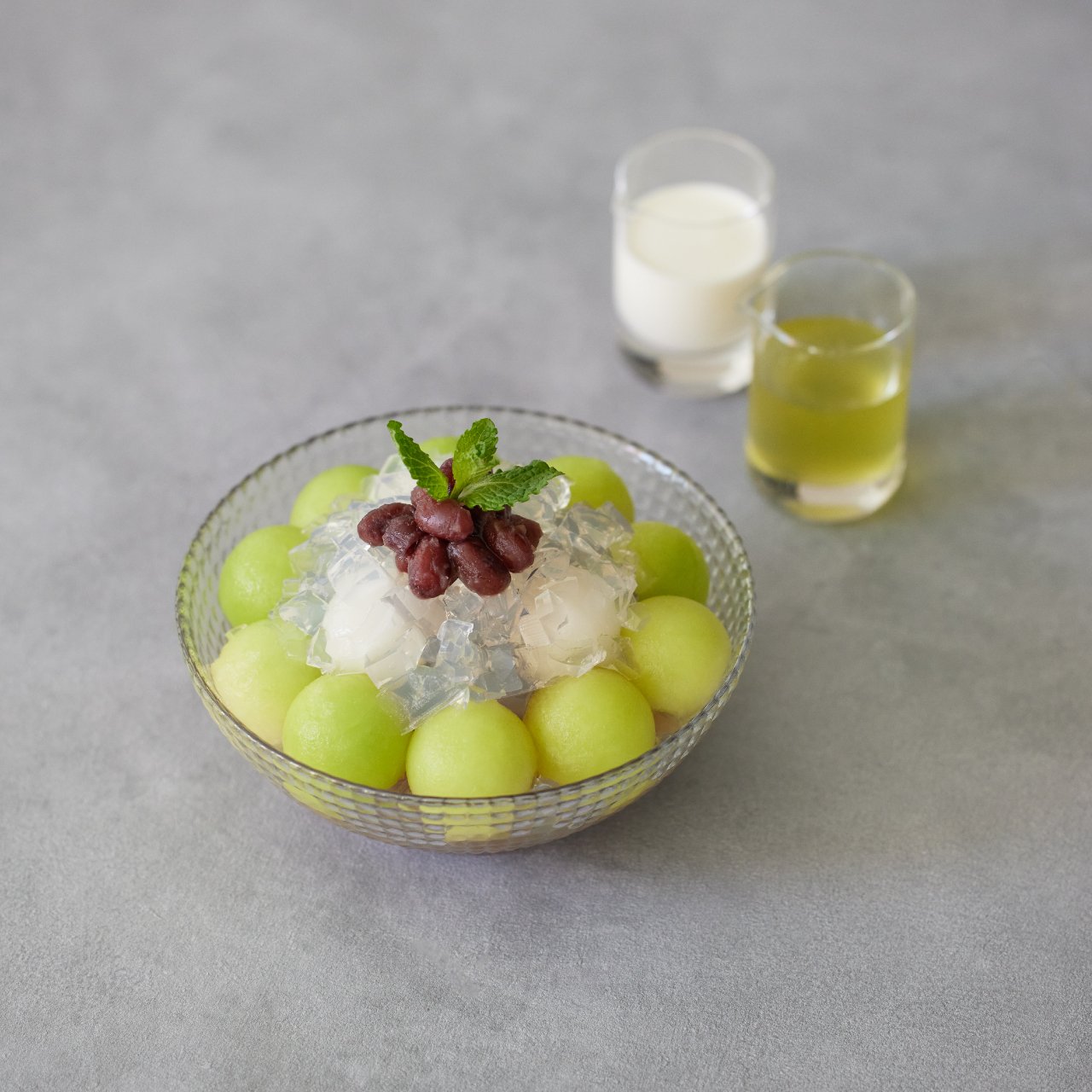 和菓子職人ではなくパティシエによりアレンジの施されたおはぎやあんみつが、新しさを感じさせる。なかでも、季節の果実をたっぷりと使用した、パフェのように華やかなあんみつは見逃せない。コロンとくり抜いた旬の完熟メロンが鮮やかに映え、ひと口ごとにジューシーな食感が広がる。