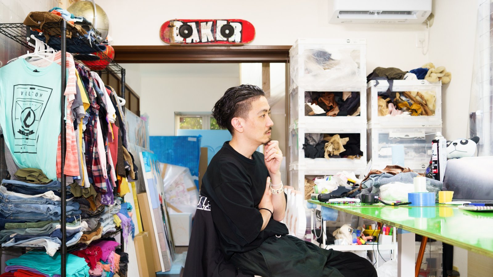 長く勤めたアパレルメーカーでの谷敷の肩書は、ビジュアルマーチャンダイザー。店舗やイベントでのディスプレイやスタイリングといった視覚表現を行ってきた。作品人物の服装について彼は以下のように語っている。