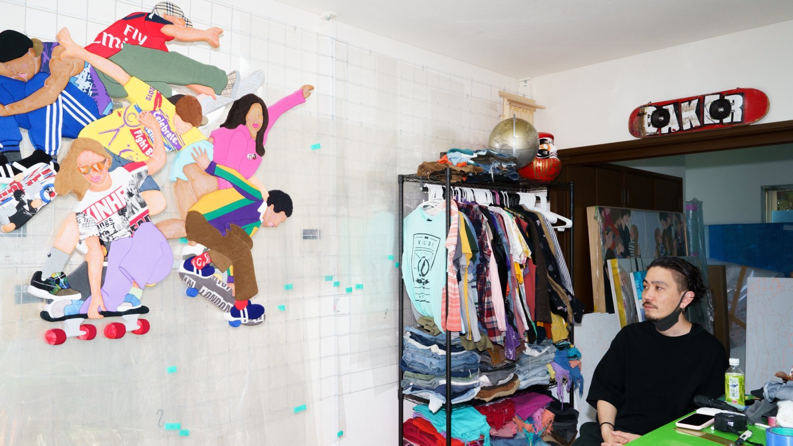 作品制作の仕方を特別に披露してくれた。スケーターのデニムパンツの一部を取り付ける工程だ。手法は木彫りの雛人形に着物を着せるのに用いられる「木目込み(きめこみ)」から着想したもの。日本の伝統技法の現代的解釈である。