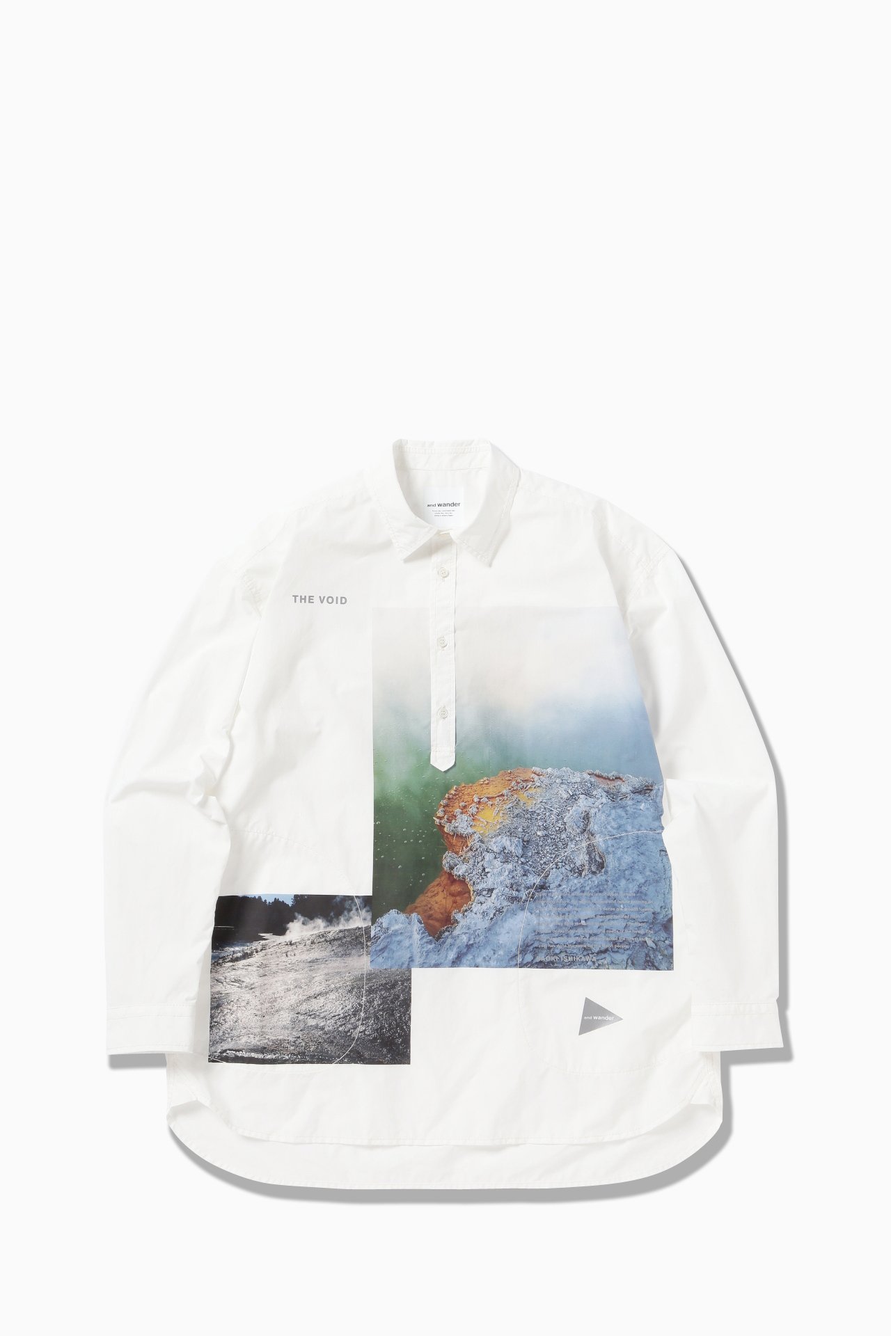 同会場では『THE VOID』の掲載写真をプリントしたコラボレーションアイテムを販売。アンドワンダー定番のコーデュラタイプライターシャツ2型とTシャツが、石川氏の写真により鮮やかに彩られる。自然のフィールドを相手にする両者の合作は、実用性を考慮したディテールも搭載されるなど、軽やかな着こなしを楽しむことができそうだ。