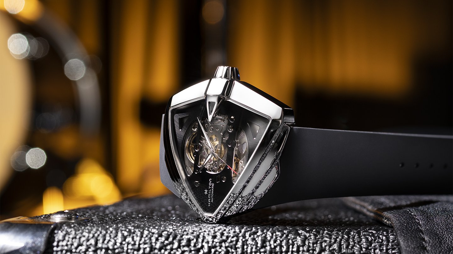 丸型でも角型でもなく、トノーやクッション型でもない。65年前に誕生し、独創的な三角形のフォルムで驚きを与えたハミルトン「ベンチュラ」から、迫力あるラージケースにスケルトンダイヤルを組み合わせた新作が登場した。「ベンチュラ XXL スケルトン オート」のケース幅は46㎜。そのボリュームだけでも圧倒されるが、大胆にカットアウトされたインデックスのないスケルトンダイヤルから自動巻きムーブメントが見える。歯車などを重ねた機械式の精緻なメカニズムと、時計の心臓部であるテンプのダイナミックな鼓動が、三角形のケースフォルムに新たな力強さと魅力を加えたといえそうだ。