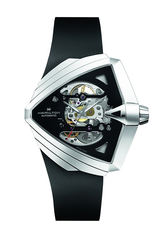 「ベンチュラ」が初めて発表されたのは1957年。常識破りのケースデザインが世界を仰天させたが、ムーブメントも世界初の電池式を搭載しており、ゼンマイを巻く必要のない革新的な腕時計だった。むしろ、このハイテクをアピールする効果的なスタイルとして、類例のない三角形のフォルムが発案されたのかもしれない。