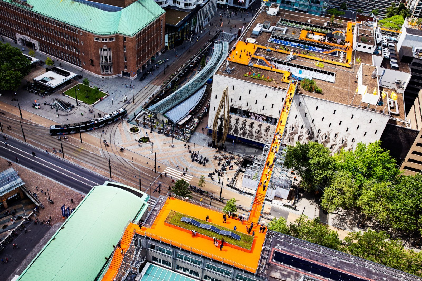 ネオンオレンジの「ロッテルダム・ルーフトップ・ウォーク」は、街随一の目抜き通りコールシンゲルを挟んで建つ建物のルーフトップを、地上30mの高さで繋いだ全長600mの遊歩道だ。コールシンゲル上空に架かる長さ60mの歩道橋は、高所恐怖症の人にはたまらなくスリリングだが、これまでに見たことのない目線から一望する迫力あるシティースケープに、訪れた人々は皆感嘆の声をあげる。