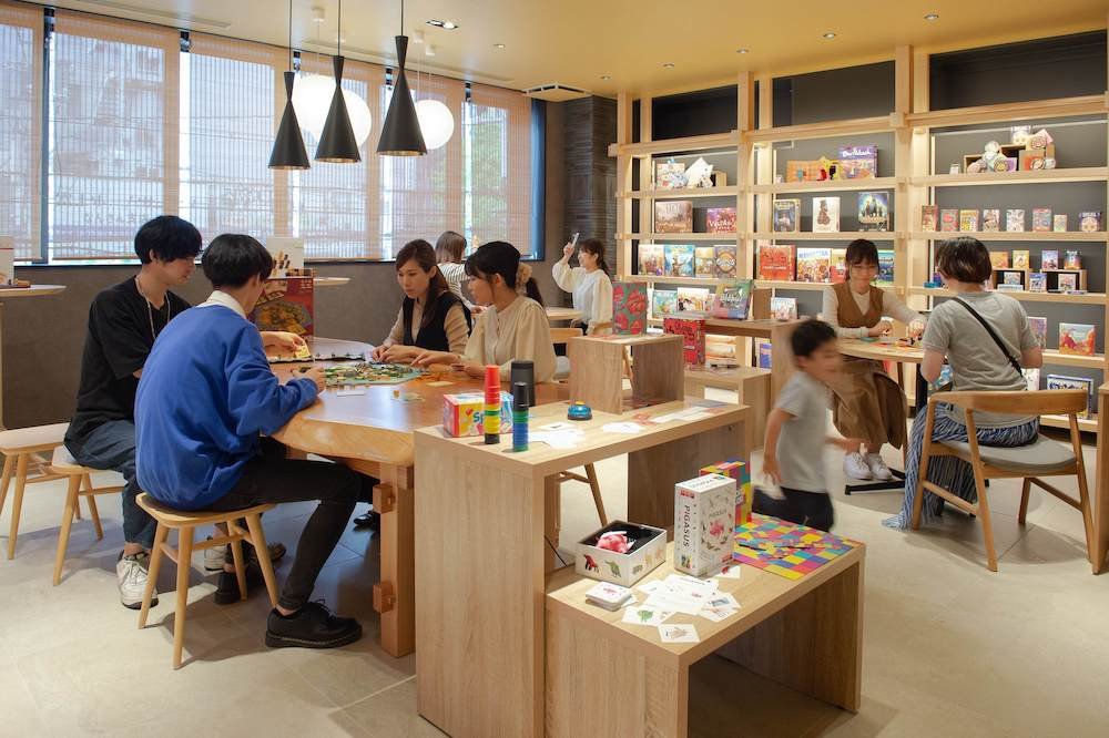 「遊べる縁側」には、日本のボードゲームブームを牽引するボードゲームカフェ「JELLY JELLY CAFE」のオーナー、白坂翔氏が厳選した130種類以上の世界中のボードゲームがずらり。小上がりの方は子どもも楽しめるような比較的ライトなもの、テーブル席の方にはじっくり遊べるものが並ぶ。ボードゲームの多彩かつ奥深い魅力を知ってほしいと、王道のものから新作まで、大人からこども、初心者からボードゲーム好きまで、みんなが楽しく遊べる多種多様なゲームを揃えている。金土日祝日にはコンシェルジュとして「JELLY JELLY CAFE」のスタッフがサポートしてくれるので安心だ。