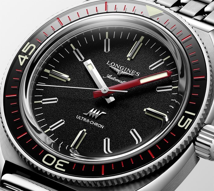 新作の「ロンジン ウルトラ-クロン」は、外装もスタイリッシュにブラッシュアップ。オリジナルはクッションケースがリューズガードを兼ねて横に張り出していたが、スレンダーな細面になった。現代的なフェイスに変貌したといえるだろうか。ダイバーズウォッチでは不可欠な逆回転防止ベゼルも、ロンジンでは初のサファイアクリスタルはめ込み。ダイヤモンドに次ぐ硬度なので傷がつかないだけでなく、透明な艶が美しく映える。目盛り線は分針と同じくラッカー塗装によるレッド。時針と15分おきの数字はホワイトと明晰なカラーリングも心地良い。要所に蓄光式蛍光が塗布されているので、夜間などでの視認性も確保されている。