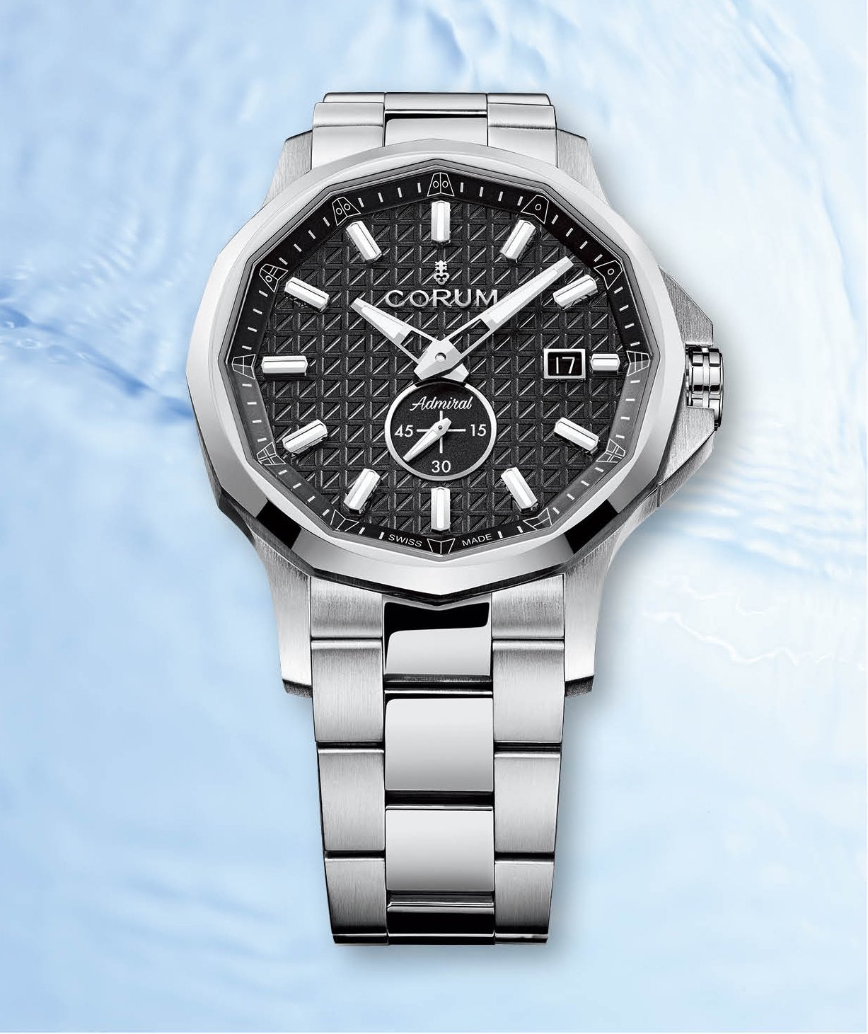 外洋ヨットレース「アドミラルズカップ」に由来したコレクションで、船用金具をイメージした12角形ベゼルや国際信号旗を使ったインデックスなど、海を彷彿させるデザインを取り入れたマリンスポーツウォッチだ。その新作は、「グレナディア・フェンドゥ」と命名されたダイヤル装飾が取り入れられ、全体的に落ち着いたダークトーンでまとめられている。