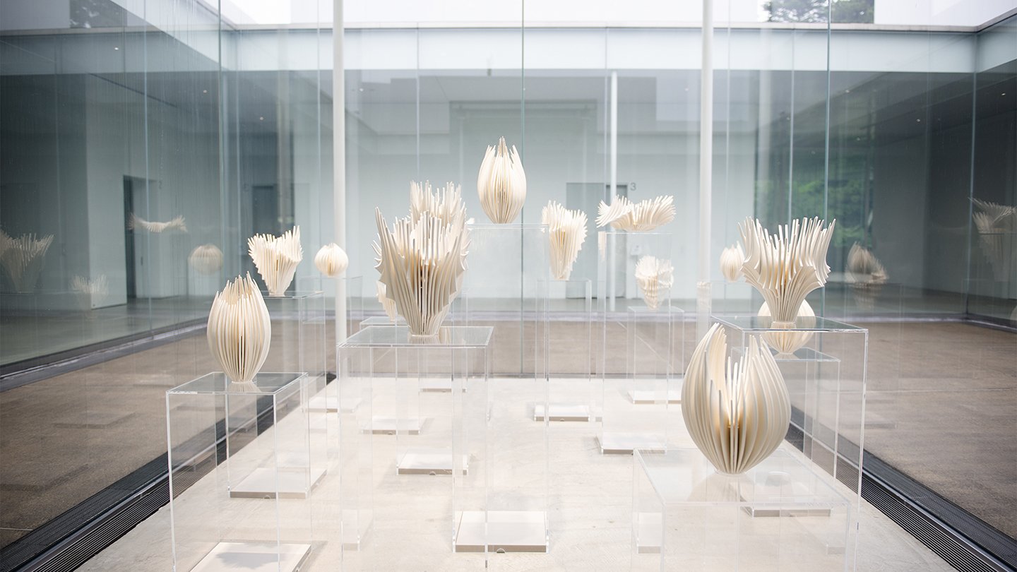 「美術館が更地にできあがっていくプロセスを高校時代に通学路で見ていました。スラブが立ち上がり、外壁がガラス面で覆われていく様子から、美術館の『浮遊性』を強く感じたことをよく覚えています。今回はその原風景を出発点に、ガラスで覆われた展示室に特注のアクリル展示台を15台用意し、4方向から見てそれぞれの作品が被らないように建築的に配置しました。太陽の光を浴びながら、植物が光合成することと同じように、それぞれの敷地(展示台)の具体的な環境情報を読み込み、作品がその場所の光を獲得していく自然発生的な形状デザインを試みています。均質な空間に小さな揺らぎのようなものをつくりたかったのです」