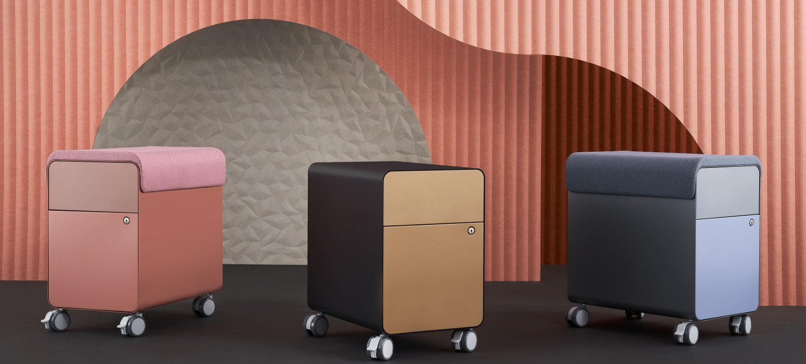 スムーズに動くキャスターの搭載で、ロッカー収納にはない機動力と携帯性を備えている。さらに、やわらかな雰囲気を醸し出すクッショントップをまとい、本体は流れるように繊細な未来型フォルムへと変身。豊富なカラー展開でワークスぺースを色鮮やかに演出し、存在感のある収納ワゴンへと昇華させた。