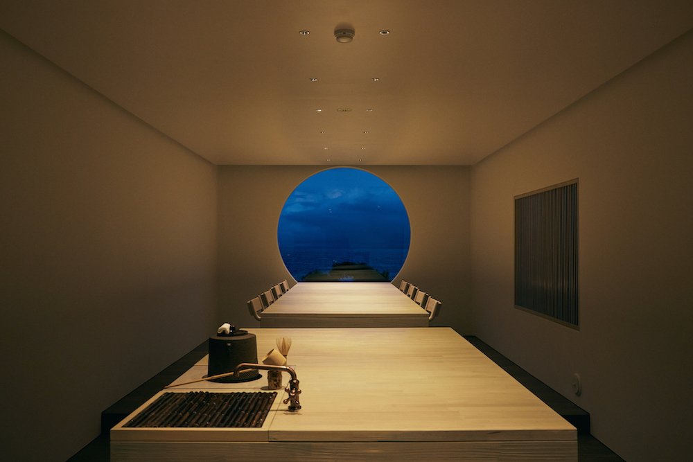チェックアウトは10時半なので、朝食後にもう一度ベッドでごろごろしたり、海沿いを歩いたり。最後、宿を去る前に「満月のダイニング」の丸窓を見れば、夏陽が差そうとしている。さまざまな時間や季節の景色を移す、この丸窓と出合いに。「月と鮪 石上」は四季ごとに訪ねたくなる宿なのだ。
