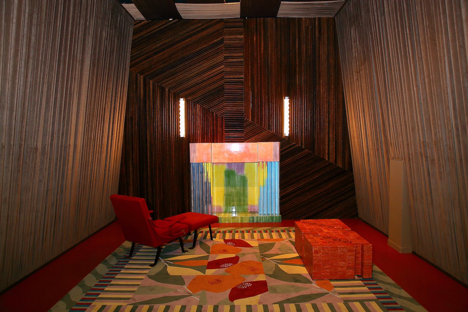 異なるサイズの2つのブロック体を縦横に組み合わせ、ソファ、ベンチ、テーブルなど、さまざまな形を実現する「モジュラー・イマジネーション」は、昨年他界したヴァージル・アブローの遺作。硬質で工業的な外観にもかかわらず、座り心地はとても柔らか。素材もリサイクル可能。鮮やかなオレンジ一色でまとめた空間に、いくつものモジュラーを並べていた。