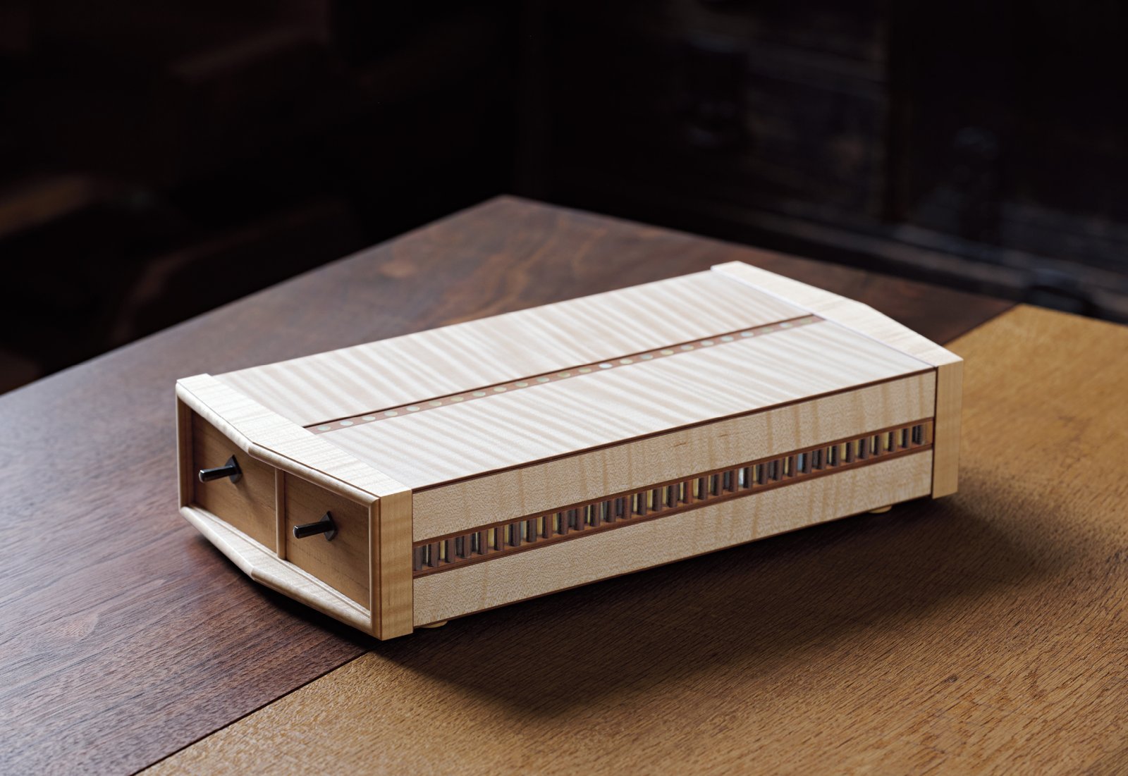 左:小箪笥の側面に設けられた格子状の細かなスリットを覗きながら、内側をスライドさせると3種類の象嵌紋様が現れては消え、万華鏡のよう。 右:エッジ部分をよく見ると細かに切り込みが入っているのがわかる。これは緊張感のある角ながら、触ったときには、指先には柔らかく当たるように配慮した超絶技法のひとつ。