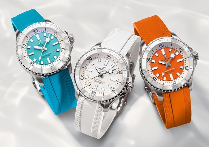 ブライトリングは1960〜70年代にユニークなダイバーズウォッチ「スーパーオーシャン スローモーション」をラインナップしていた。クロノグラフにもかかわらず、秒の計測機能を削除。センターの時分針と同軸のクロノ針は分積算計であり、1時間をかけてダイヤルを一周することから「スローモーション」と呼ばれた。カーレーサーなどと違って、ダイバーに必要なのは秒ではなく分単位の正確な把握と判断したという。それ以外の余計な要素を排除する一方で、分表示の視認性などを徹底的に追求した機能重視のモデルだった。