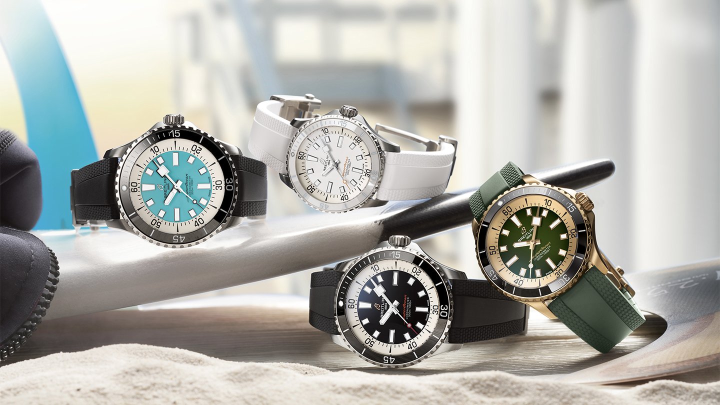 コレクションの幅の広さも評価したい。ケース径は46、44、42、36㎜の4サイズ。とりわけ36㎜径のスモールモデルは、女性だけでなく、腕の細い男性にも無理なくフィットする。ケース素材はSS、 ラグジュアリーなSSと18KRGのコンビ、経年変化を楽しめるブロンズの3種類。スポーティなラバーストラップだけでなく3連のメタルブレスレットを選べる。どちらもフォールディングクラスプで備調整(約10〜15㎜)が可能。ケースサイズによるが、ダイヤルカラーもブラック、ブルー、ターコイズ、グリーン、ブラウン、シルバー、ホワイト、オレンジと豊富だ。サーフィンのチャンピオンであるケリー・スレーターと共同でデザインした限定モデルもラインナップされている。