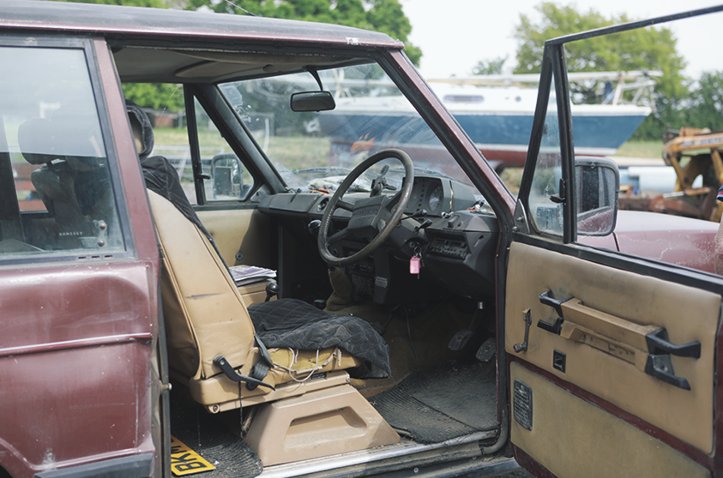 個人オーナーから500ポンドで購入後、コンテナに保管されたままのヴォーグはエンジン交換が必要な状態。ジュニアの性格らしく、すべてのパーツは捨てずに保管されている。左右のコンテナには、約5台分のレンジローバー・クラシック専用のパーツが保管されている。