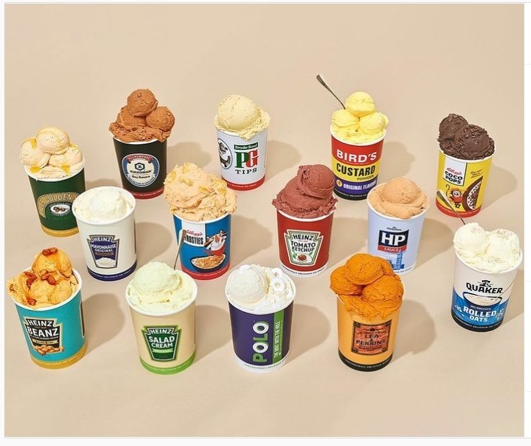 全14種類のアイスクリームは、イギリス人になじみの食品や調味料ブランドとのコラボ・フレーバーだ。