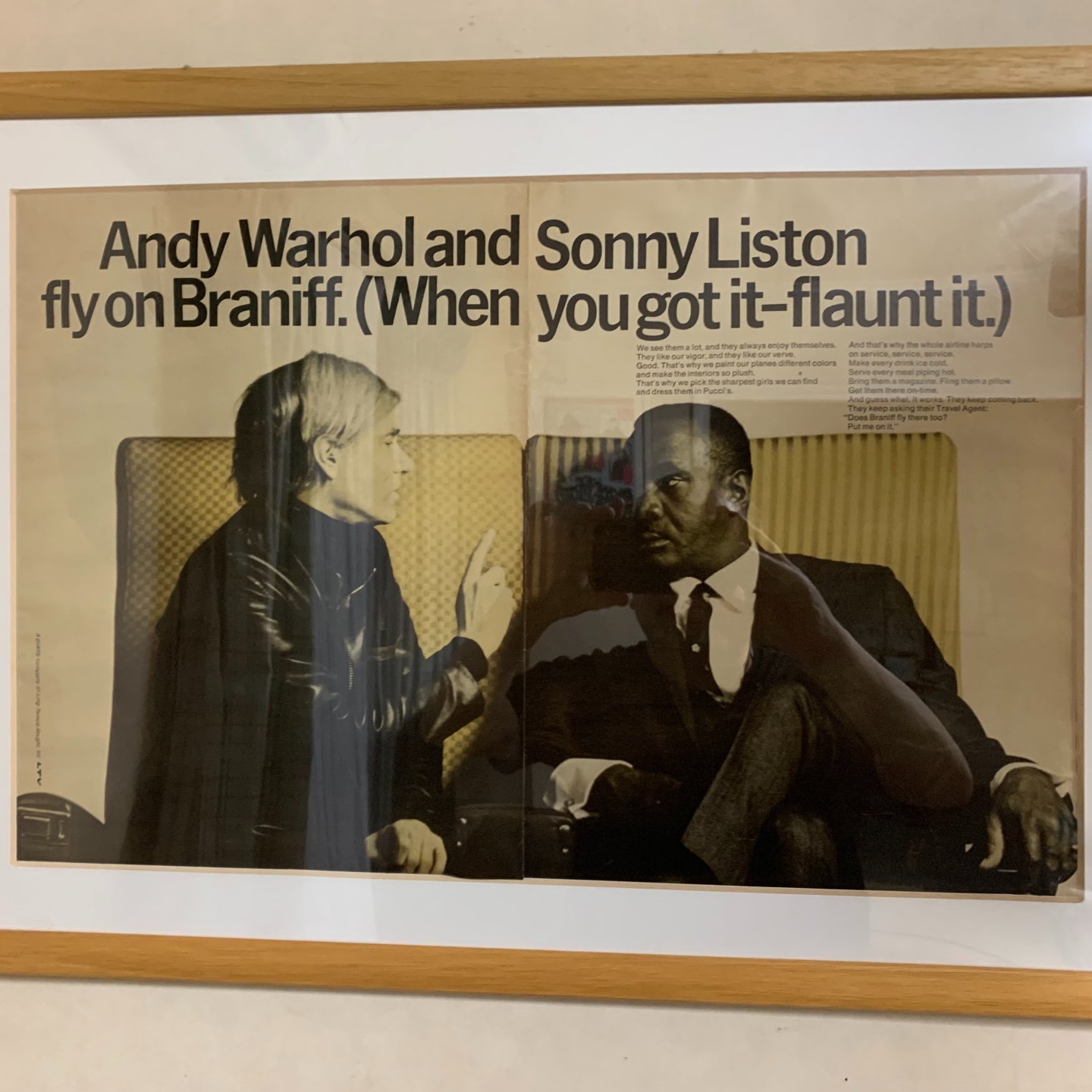 左にウォーホル、右にプロボクシング元ヘビー級チャンピオンのソニー・リストンという構図だ。新宿の某百貨店で販売されていたもので、ウォーホルの写真に引き寄せられて近づいたが、購入を最後に決めたのは、そこに入った「fly on Braniff」の文字。もしかしたらウォーホルが出演した「ブラニフ航空(Braniff International Airways」と関係があるのではないかと思ったからだ。